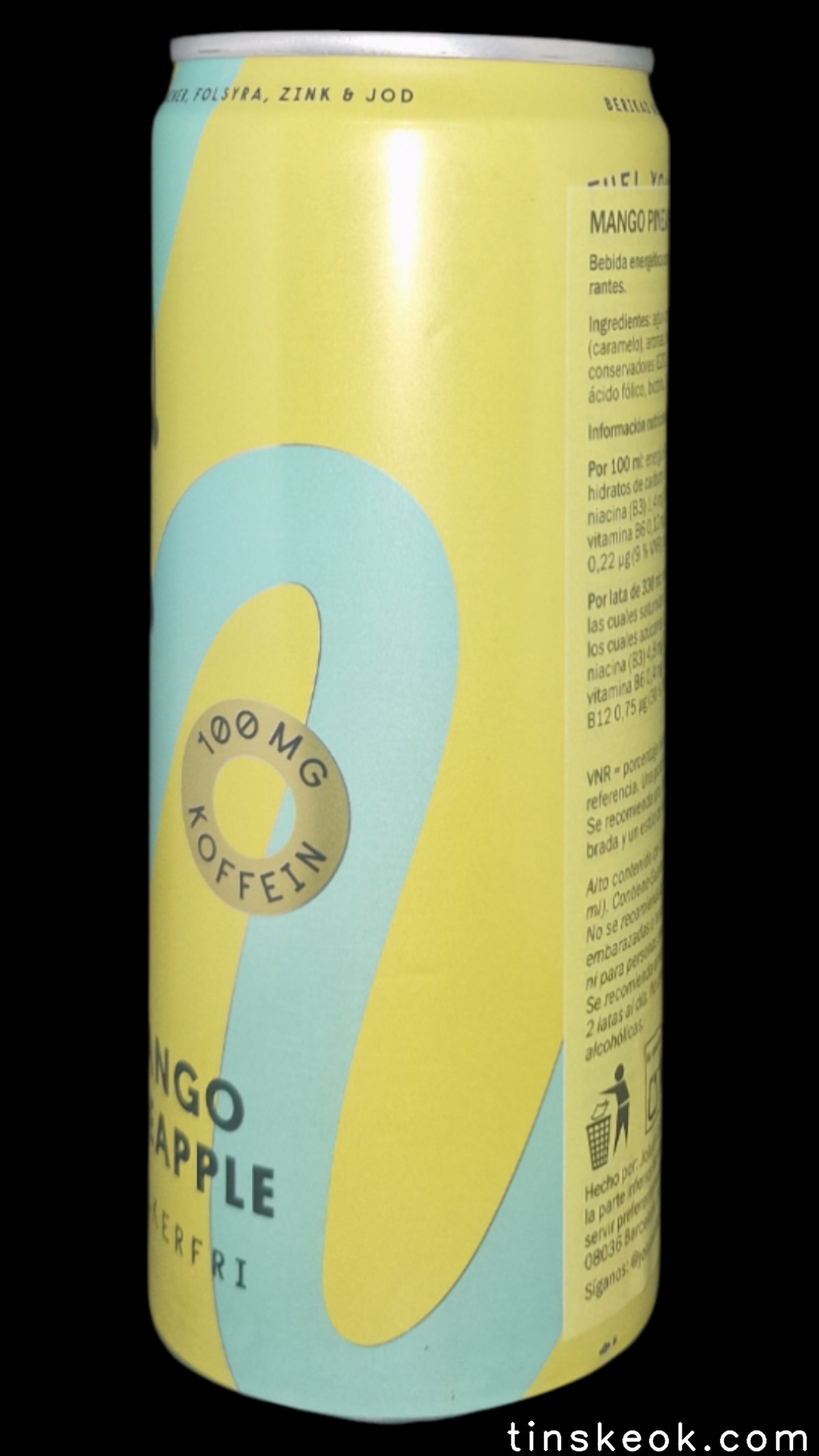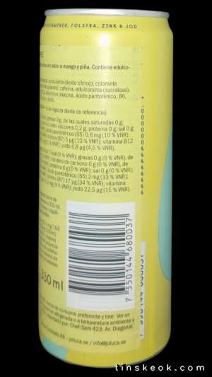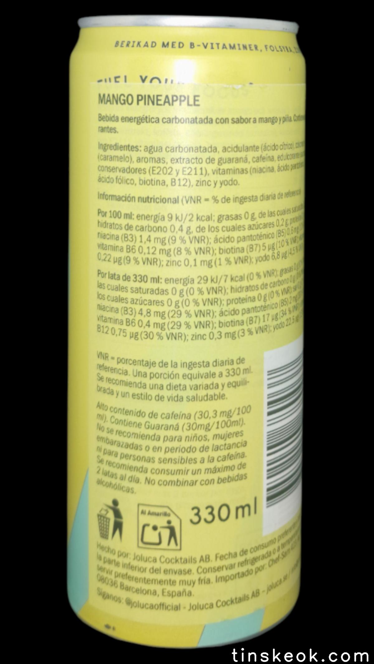 Agua carbonatada, acidulante (ácido cítrico), colorante (caramelo), aromas, extracto de guaraná, cafeína, edulcorante (sucralosa), conservantes (E202 y E211), vitaminas (niacina, ácido pantoténico, B6, ácido fólico, biotina, B12), zinc y yodo. *El ácido pantoténico contribuye al rendimiento mental normal.