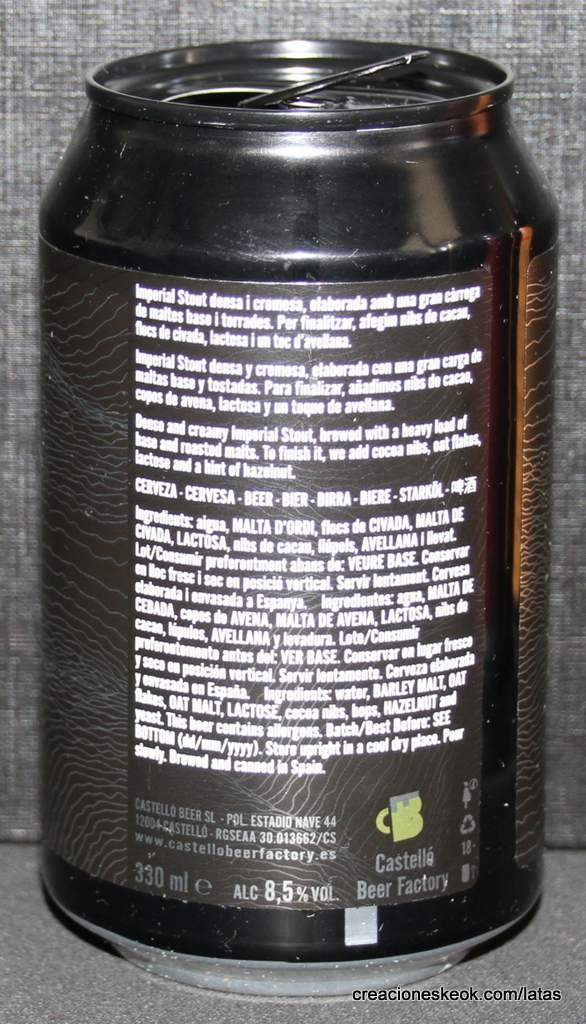 Estilo: Imperial Chocolate Milk Stout Imperial Stout densa y cremosa, elaborada con una gran carga de maltas base y tostadas. Para finalizar, añadimos nibs de cacao, copos de avena, lactosa y un toque de avellana.