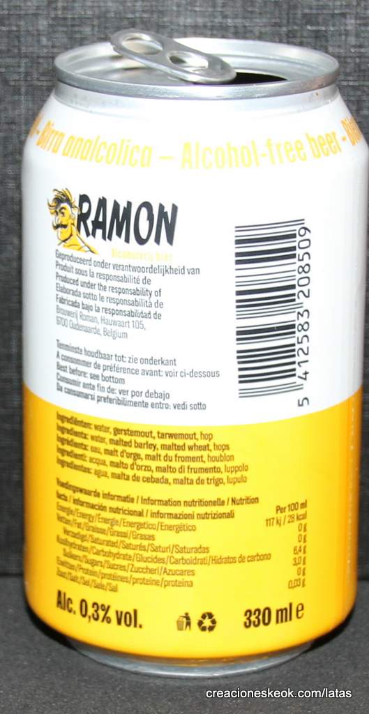 Proceso de elaboración único: volumen alcohólico 0,3%, menos calorías Gracias al uso de una levadura única, la Cervecería Brouwerij Roman logra elaborar una cerveza rica y sorprendentemente refrescante con apenas alcohol. Pero sobre todo distinta. La cerveza Ramon contiene solamente un 0,3% de volumen alcohólico y 28 calorías/100 ml. ¡Por consiguiente, la cerveza Ramon es perfectamente compatible con un estilo de vida activo y saludable! Los maestros cerveceros han optado por sabrosas variedades de lúpulo: Hallertauer, Galaxy y Simcoe. Cata Olor/aromas: Nariz fresca y afrutada con matices de cítricos Sabor: Ramon combina un sabor refrescante y afrutado con un suave amargor