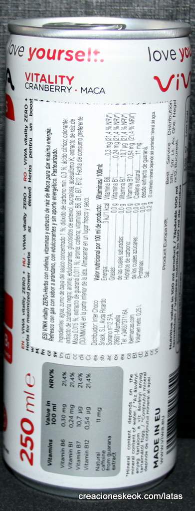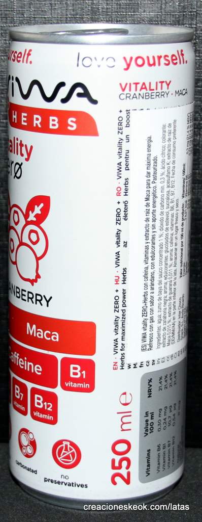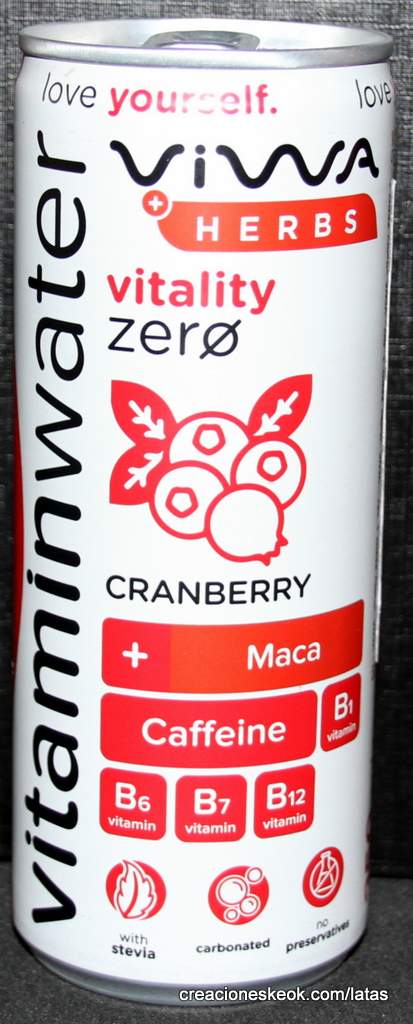 VIWA+Herbs vitality ZERO con cafeína, vitaminas y extracto de raíz de Maca para dar máxima energía. Refresco con gas con sabor a arándano, con edulcorantes y sin aporte energético. Pasteurizado. Ingredientes: agua; zumo de baya del saúco concentrado 1 %; dióxido de carbono mín. 0,3 %; ácido cítrico; colorante: extracto de zanahoria negra; aroma; edulcorantes: glucósidos de esteviol, sucralosa, acesulfamo K; extracto de raíz de Maca 0,015 %; extracto de guaraná 0,011 %; aroma: cafeína; vitaminas: B6, B1, B7, B12.