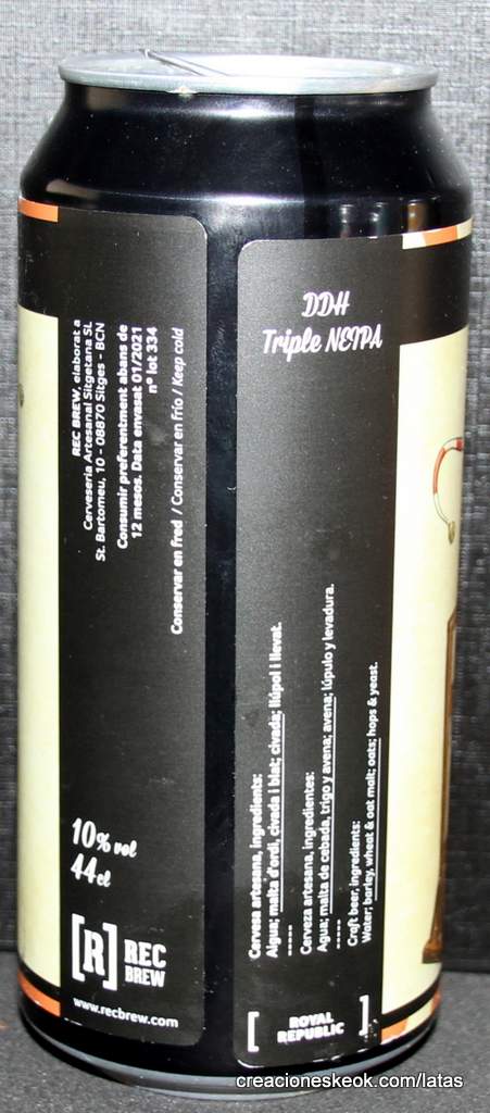 Primera TNEIPA de la casa, queriendo llevar más al extremo nuestras IPAs, dejando la cerveza en 10% de alcohol, bien integrados, gracias a la combinación de maltas y el control de la fermentación. Rec Brew Royal Republic es una Triple NEIPA elaborada con maltas de cebada, trigo y avena, que aportan textura y cuerpo. Con doble dry-hooping en gran cantidad, primero de lúpulos Citra y Enigma, de lúpulo Cryo Amarillo después. De cuerpo se presenta muy turbia y de color dorado pálido, produce una corona de espuma blanca, jabonosa y persistente. Intensos aromas a fruta de hueso y cítricos. En boca destaca su textura sedosa y su densidad, dónde se despliega toda su intensidad de notas frutales. Final más seco y con un amargor moderado. ABV del 10% perfectamente integrado.