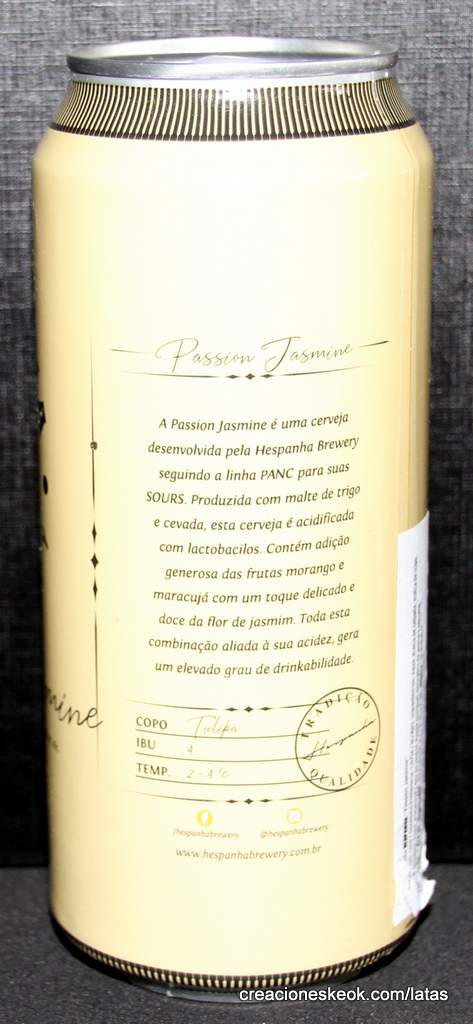 Passion Jasmine de Hespanha es una Sour/wild ale procedente de Brasil. Tiene una nota de 4,16 en Untappd, en boca tiene un nivel de alcohol bajo (4%) junto a un amargor moderado. Las Sour ales, también conocidas como wild ales, forman una categoría que engloba todo tipo de ales fermentadas con bacterias diferentes a las levaduras cerveceras tradicionales—siendo las Brettanomyces, Lactobacillus, Pediococcus o las Acetobacter los ejemplos más comunes. Estas cervezas se elaboran por medio de fermentación espontánea. Las levaduras aéreas responsables de dicha fermentación varían de una parte a otra del mundo, siendo la actividad cervecera muy probablemente una de las causas de esta variación.