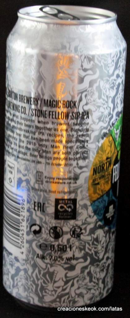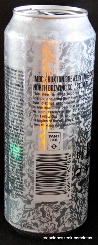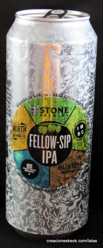 Fellow-Sip, la IPA colaborativa de Stone, Buxton, North y Magic Rock Cuando sus head brewers se congregaron en Marienpark, en la sede europea de Stone Brewing en Berlín, lo hicieron simplemente como cuatro cerveceros que sentían el más profundo respecto por el trabajo de cada uno de sus homónimos. Cuando terminaron, lo hicieron como buenos amigos dispuestos a participar en futuras colaboraciones, confirmando algo que ya sabíamos todos: la cerveza une a las personas y fortalece sus relaciones. ¿Y el resultado de esa unión? Pues una American IPA que sigue el estilo de las India Pale Ale fabricadas en la Costa Oeste de los EEUU y, como ya hemos mencionado antes, combina los ingredientes y las recetas de las IPA más icónicas de cada uno de sus autores. De color dorado casi pajizo y aspecto turbio al no estar filtrado, se trata de una cerveza muy lupulada y aromática, con notas a frutas tropicales, lichis y cerezas y un sabor algo resinoso y cítrico como consecuencia del uso de lúpulos de las variedades Citra, Mosaic y Ariana, además de maltas de trigo y cebada (Pilsener y Golden Promise). Por lo demás, es una IPA con una graduación alcohólica del 7%, muy equilibrada aunque moderadamente amarga (ronda los 65 IBUs) y con mucho cuerpo, que se comercializa en las nuevas latas UNIQCAN creadas por Stone Brewing, decoradas con la mítica gárgola de la marca nacida en California hace ya más de 20 años. En definitiva, se trata de una de las mejores IPA que ha visto el mercado este año, tan excelsa como largo es su nombre oficial al completo: IMBC / Buxton Brewery / Magic Rock / North Brewing Co. / Stone Fellow-Sip IPA.