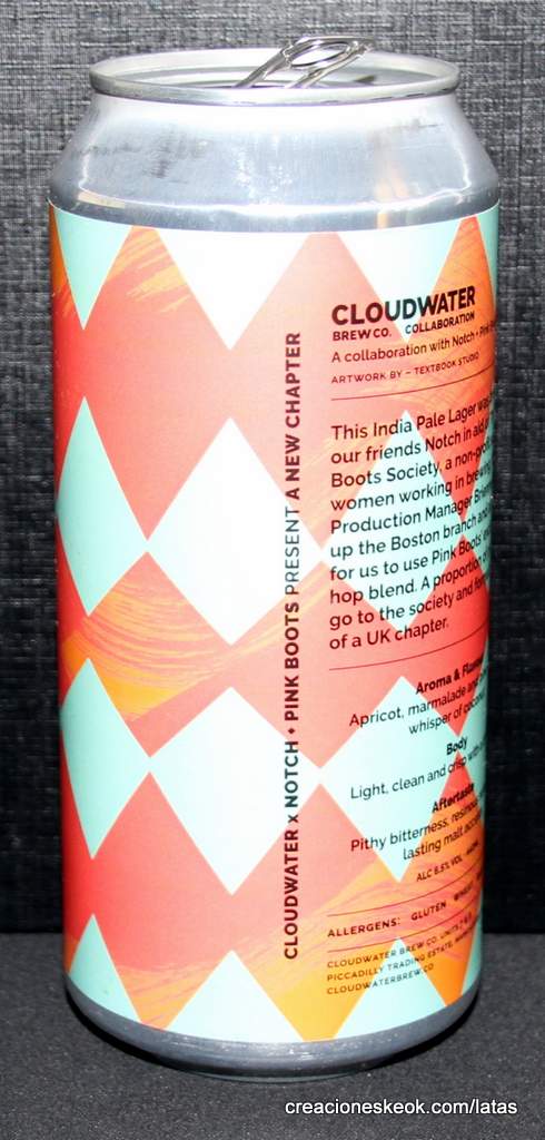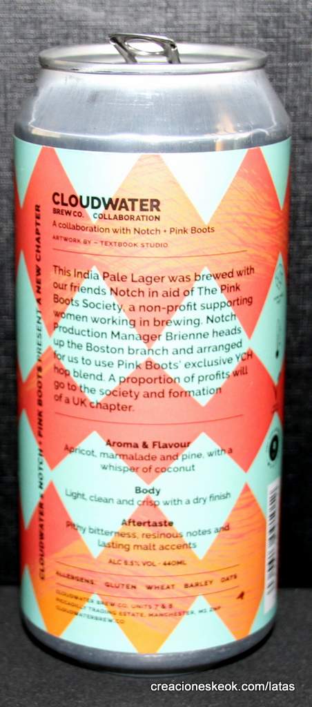 Esta India Pale Lager se elaboró ??con amigos de Notch en apoyo de The Pink Boots Society, una organización sin fines de lucro que apoya a las mujeres que trabajan en la elaboración de cerveza. La gerente de producción de Notch, Brienne, dirige la sucursal de Boston y arregló para que Cloudwater use la mezcla de lúpulo YCH exclusiva de Pink Boots. Una parte de las ganancias se destinará a la sociedad y la formación de un capítulo en el Reino Unido.
