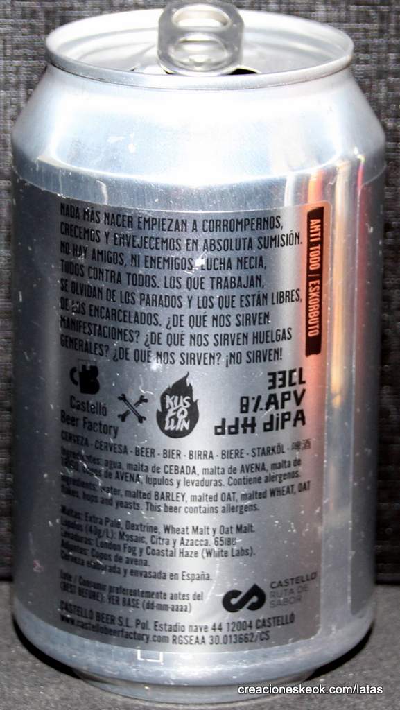 Cerveza artesana elaborada por Castello Beer Factory y Kusfollin que nos traen esta cerveza ipa, con un diseño anti-todo de estilo NEW ENGLAND DOBLE IPA, esta cerveza limitada esta pensada para sorprender al amante del lúpulo. Con una puntuación en la guía de cervezas Untappd inexistente al tener todavía muy pocas valoraciones.