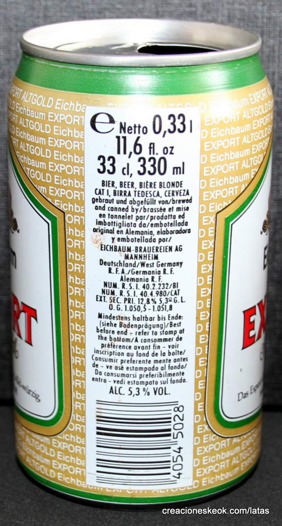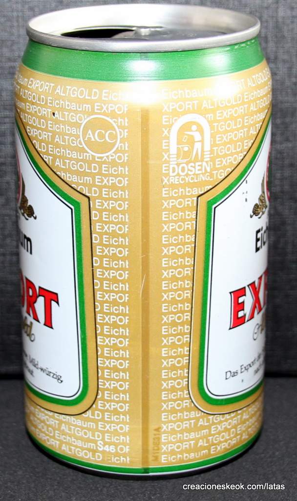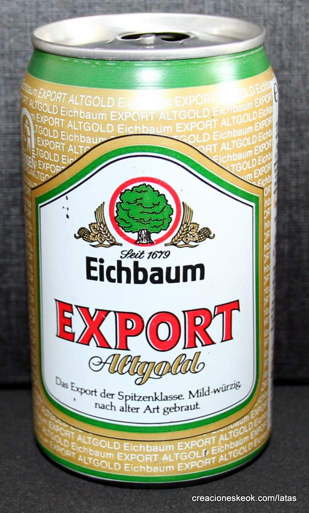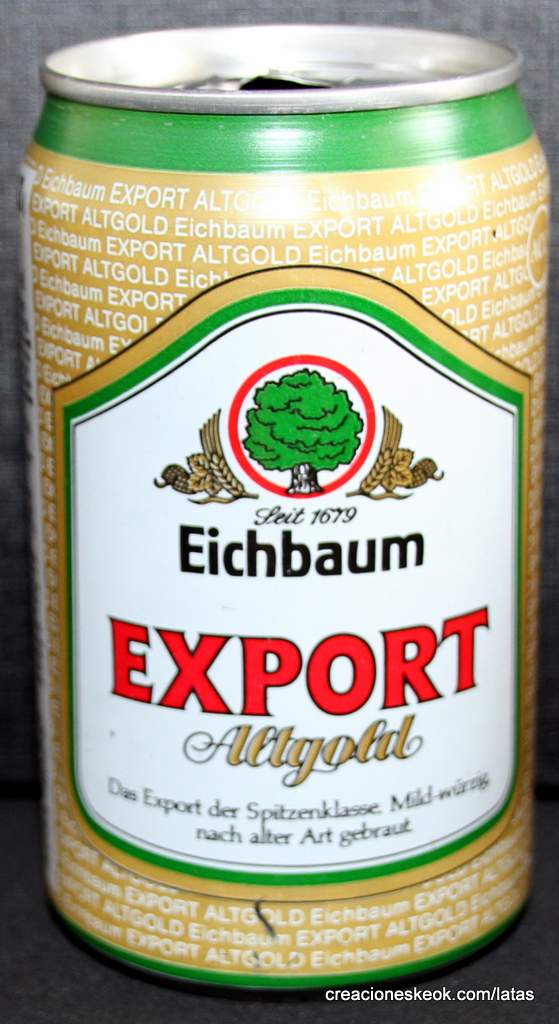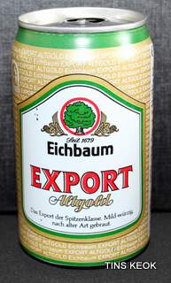 Lata de cerveza Eichbaum fabricada en Alemania en la década del 80, esta cervecería con sede en Mannheim se fundo en 1679 de la mano de Jean du Chaine, en ese momento en la región de Mannheim ya había cerca de 25 tabernas que se dedicaban a producir cerveza. En 1689 fue destruida la cervecería, al ser victima de la Guerra de Sucesión del Palatinado, en 1717 se reconstruyo, en 1827 empezó un plan de expansión de la empresa, en 1870 trasladaron la producción a un sitio mas grande (donde todavía se encuentran las instalaciones), en 1881 se convirtió en sociedad anónima, hasta convertirse antes de la 1ra Guerra Mundial en una de las cervecerías mas grandes del país. Luego de finalizada la guerra la ocupación aliada de las zonas cercanas, corto una gran cuota de mercado, por ello en 1929 se asociaron a otras cervecerías para formar Eichbaum Werger Brauereien AG. La empresa paso por tiempos de crisis hasta 1936, aunque al comienzo de la 2da Guerra Mundial, volvió a caer a niveles muy bajos, luego de la guerra, al conseguir un contrato de proveedor del ejercito estadounidense, la empresa fue reconstruida rápidamente, en 1970 fue comprada por Henninger, en 1998 fue adquirida por la empresa de bebidas Actris. Como nota de color, se puede decir que los pozos de agua que la empresa utiliza, esta justo al lado del cementerio principal de Mannheim, eso provoca leyendas y bromas referidas a las propiedades y gusto de la cerveza.