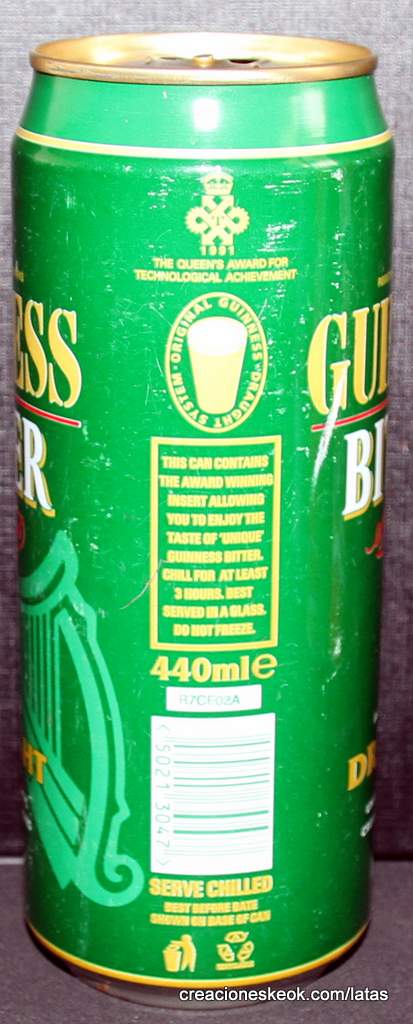 Guinness fue una de las primeras cervecerías en imprimir y etiquetar sus botellas para asegurarse de que los taberneros no mezclaran varias cervezas negras y las hicieran pasar por Guinness. Los que vendieran otras cervezas negras no podían portar el estandarte de Guinness y, en su lugar, tenían que solicitar las etiquetas propias de su cervecería, donde incluyeran su nombre y dirección. Así continuó hasta 1862, cuando se introdujo la etiqueta beige típica de Guinness. El diseño ha sufrido muchas modificaciones desde entonces, pero, a día de hoy, todas nuestras etiquetas tienen tres elementos: la firma de Arthur, nuestra legendaria y simbólica arpa y un nombre actualmente reconocido en todo el mundo... Guinness. Guinness (pronunciación en AFI : /?g?.n?s/) es una cerveza negra seca del tipo stout elaborada por primera vez por el cervecero Arthur Guinness en la empresa cervecera denominada St. James's Gate Brewery ubicada en la ciudad de Dublín, Irlanda. Guinness se elabora desde el año 1759. La cerveza se basa en el estilo porter, originado en Londres a principios de 1700. Se trata de una de las marcas de cerveza más conocidas y se exporta a la mayor parte de los países. Ha llegado a batir a muchos imitadores. La característica distintiva en el sabor es la cebada tostada que se mantiene sin fermentar. Durante muchos años una parte de la cerveza se envejecía para dar un sabor láctico, pero Guinness ha renunciado confirmar si esto sigue ocurriendo. La gruesa y cremosa espuma es resultado de una mezcla de nitrógeno añadida en el envasado. Lo que está comprobado es que no lleva café, pese a la creencia popular. La cerveza Guinness es un caso especial, donde una marca de bebida alcohólica hecha por una empresa privada ha llegado a identificar el alma de una nación. Guinness en Irlanda es toda una institución por derecho propio, llegando incluso a simbolizar al pueblo irlandés. En la actualidad y desde el año 1997 Guinness pertenece a la multinacional de bebidas espirituosas Diageo con sede en Londres, resultante de la fusión de Guinness UDV y Grand Metropolitan plc.