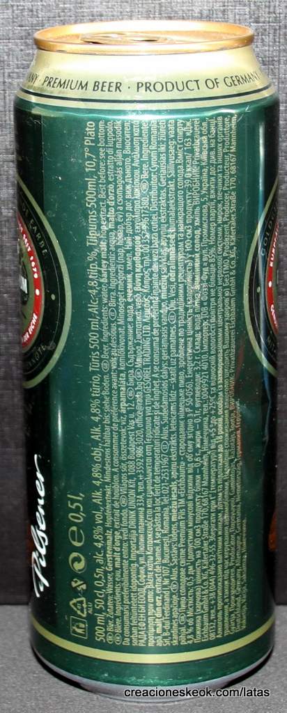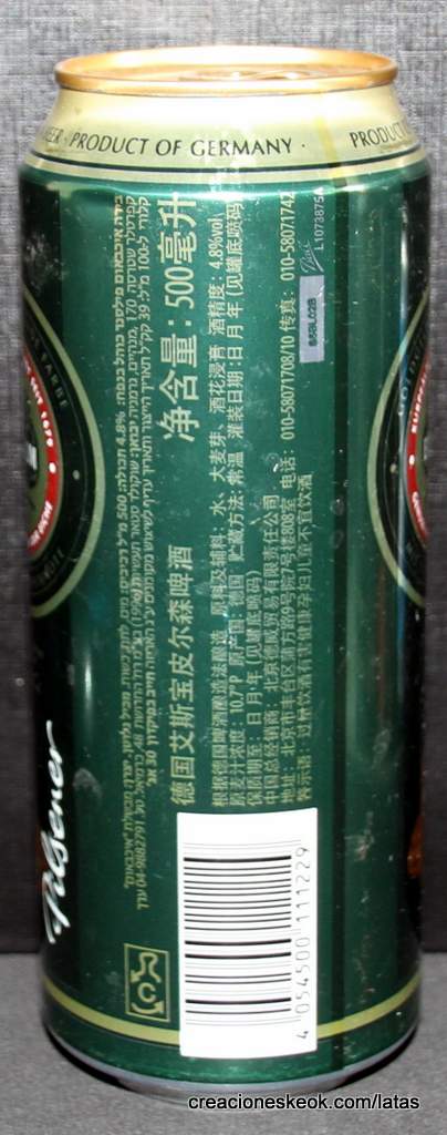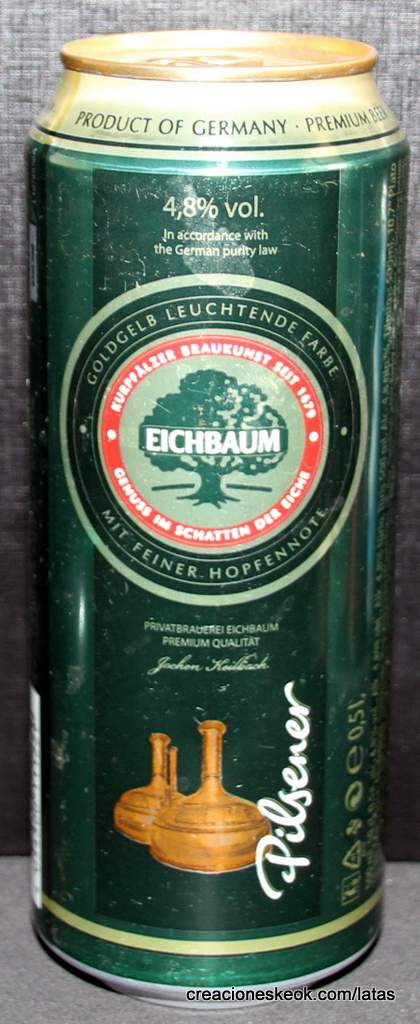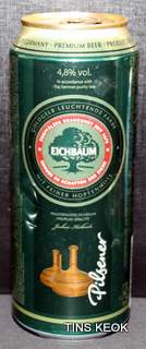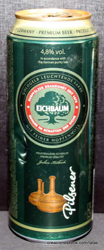 Lata de cerveza Eichbaum fabricada en Alemania en la década del 80, esta cervecería con sede en Mannheim se fundo en 1679 de la mano de Jean du Chaine, en ese momento en la región de Mannheim ya había cerca de 25 tabernas que se dedicaban a producir cerveza. En 1689 fue destruida la cervecería, al ser victima de la Guerra de Sucesión del Palatinado, en 1717 se reconstruyo, en 1827 empezó un plan de expansión de la empresa, en 1870 trasladaron la producción a un sitio mas grande (donde todavía se encuentran las instalaciones), en 1881 se convirtió en sociedad anónima, hasta convertirse antes de la 1ra Guerra Mundial en una de las cervecerías mas grandes del país. Luego de finalizada la guerra la ocupación aliada de las zonas cercanas, corto una gran cuota de mercado, por ello en 1929 se asociaron a otras cervecerías para formar Eichbaum Werger Brauereien AG. La empresa paso por tiempos de crisis hasta 1936, aunque al comienzo de la 2da Guerra Mundial, volvió a caer a niveles muy bajos, luego de la guerra, al conseguir un contrato de proveedor del ejercito estadounidense, la empresa fue reconstruida rápidamente, en 1970 fue comprada por Henninger, en 1998 fue adquirida por la empresa de bebidas Actris. Como nota de color, se puede decir que los pozos de agua que la empresa utiliza, esta justo al lado del cementerio principal de Mannheim, eso provoca leyendas y bromas referidas a las propiedades y gusto de la cerveza.
