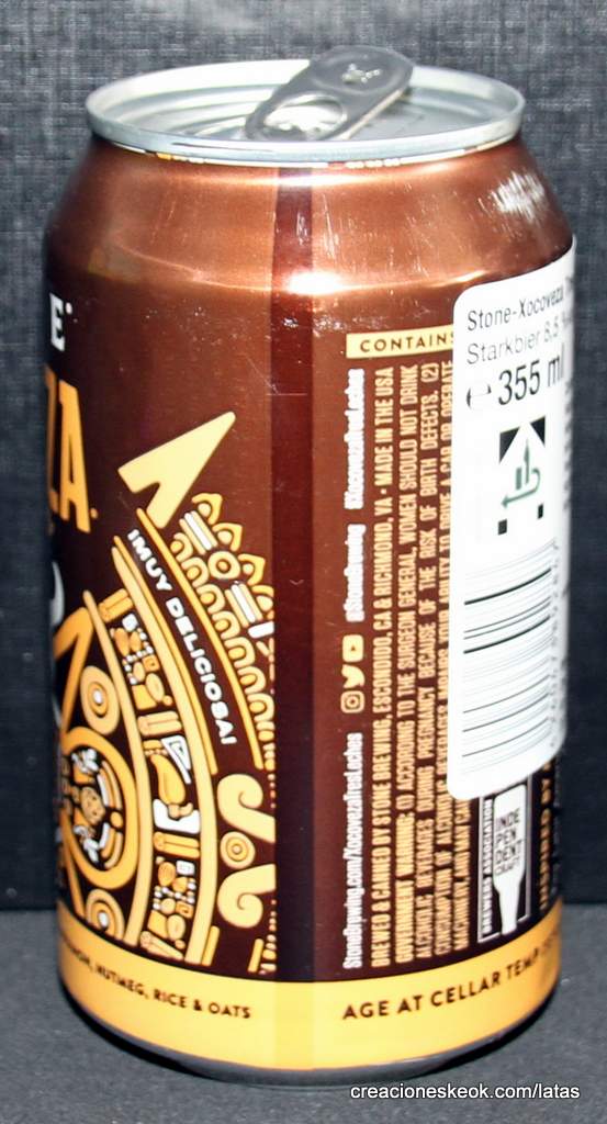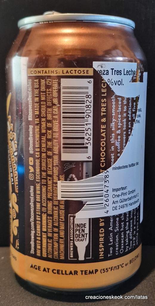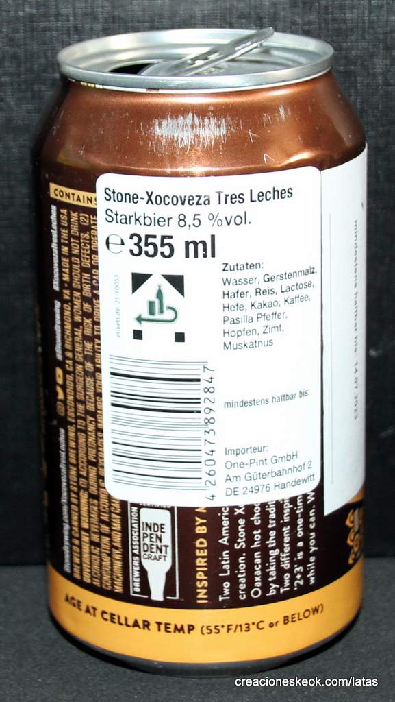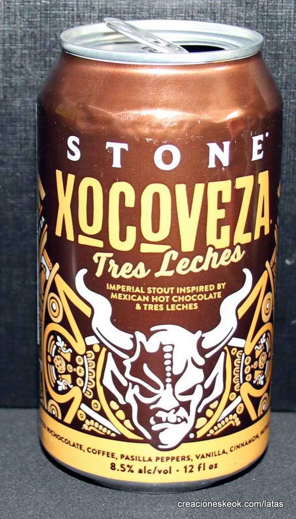 Stone Xocoveza Tres Leches combina la inspiración del chocolate caliente oaxaqueño y las golosinas Tres Leches en una imperial stout que es suave, cremosa e intensamente indulgente. Hecho de todo lo bueno de las fiestas, Stone Xocoveza se elabora con chocolate, café, chiles pasilla, vainilla, canela y nuez moscada. Al abrir la lata, el aroma es intenso: canela y especias al principio con café persistente, caramelo y vainilla dulce. Es una mezcla viva de sabores. Las especias dulces se equilibran con chocolate rico y cremoso. El sabor del café tostado suave brilla y la vainilla realza la combinación intensa. Los chiles pasilla imparten un ligero toque picante al final. Con toda esa complejidad, la cerveza es sorprendentemente brillante en el paladar, con solo un toque de la dulzura residual que implican todos los sabores decadentes.