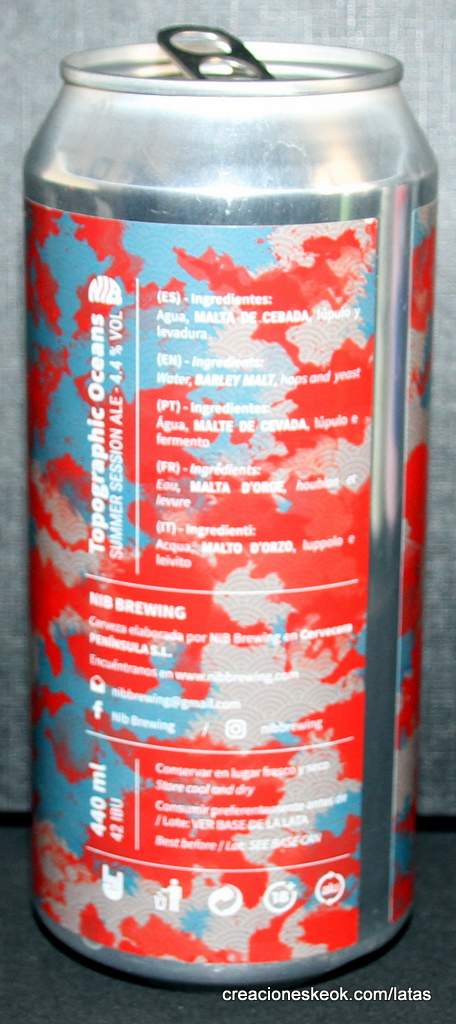 NIB Brewing Topographic Oceans es una Sesion IPA aromática, refrescante, ligera y sedosa. Elaborada con lúpulos Citra, Centennial y Huell Melón. Cuerpo limpio de color dorado brillante, con una corona de espuma blanca, esponjosa y perecedera. Notas frescas a pino, resina y cítricos. Sedosa en boca, envolvente, con un final seco y de leve amargor. Fácil de beber y fácil de disfrutar.