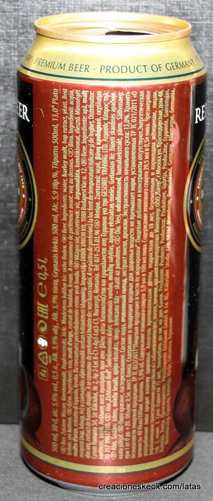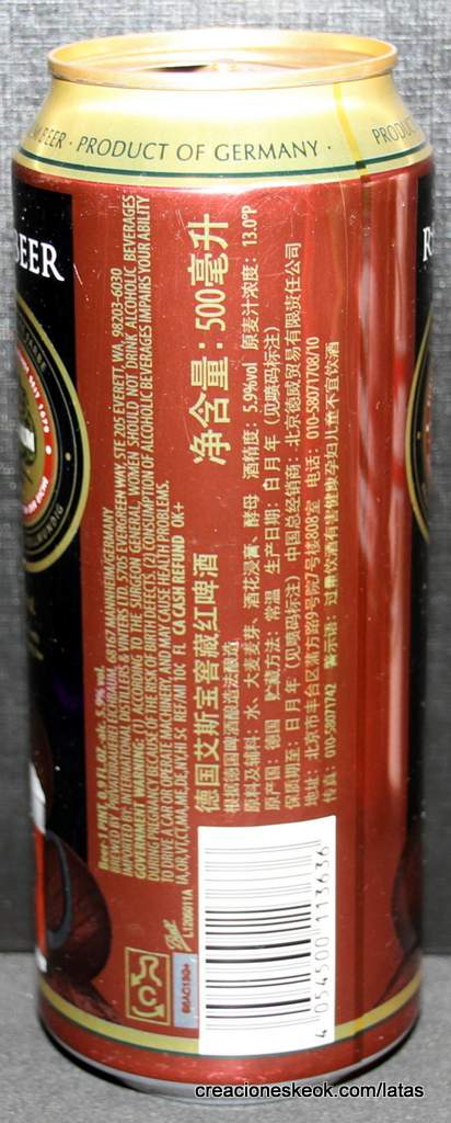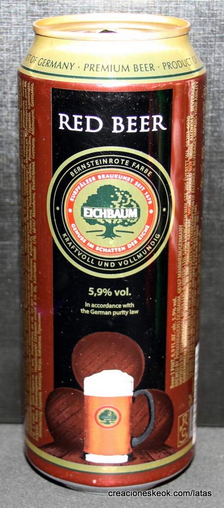 Lata de cerveza Eichbaum fabricada en Alemania en la década del 80, esta cervecería con sede en Mannheim se fundo en 1679 de la mano de Jean du Chaine, en ese momento en la región de Mannheim ya había cerca de 25 tabernas que se dedicaban a producir cerveza. En 1689 fue destruida la cervecería, al ser victima de la Guerra de Sucesión del Palatinado, en 1717 se reconstruyo, en 1827 empezó un plan de expansión de la empresa, en 1870 trasladaron la producción a un sitio mas grande (donde todavía se encuentran las instalaciones), en 1881 se convirtió en sociedad anónima, hasta convertirse antes de la 1ra Guerra Mundial en una de las cervecerías mas grandes del país. Luego de finalizada la guerra la ocupación aliada de las zonas cercanas, corto una gran cuota de mercado, por ello en 1929 se asociaron a otras cervecerías para formar Eichbaum Werger Brauereien AG. La empresa paso por tiempos de crisis hasta 1936, aunque al comienzo de la 2da Guerra Mundial, volvió a caer a niveles muy bajos, luego de la guerra, al conseguir un contrato de proveedor del ejercito estadounidense, la empresa fue reconstruida rápidamente, en 1970 fue comprada por Henninger, en 1998 fue adquirida por la empresa de bebidas Actris. Como nota de color, se puede decir que los pozos de agua que la empresa utiliza, esta justo al lado del cementerio principal de Mannheim, eso provoca leyendas y bromas referidas a las propiedades y gusto de la cerveza.