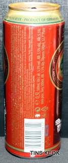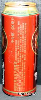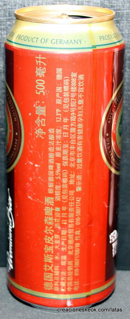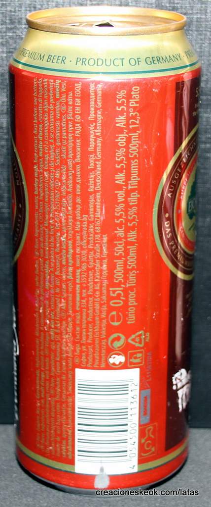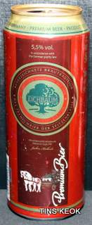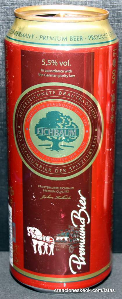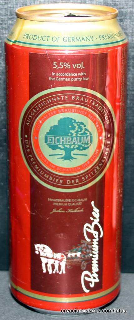 Lata de cerveza Eichbaum fabricada en Alemania en la década del 80, esta cervecería con sede en Mannheim se fundo en 1679 de la mano de Jean du Chaine, en ese momento en la región de Mannheim ya había cerca de 25 tabernas que se dedicaban a producir cerveza. En 1689 fue destruida la cervecería, al ser victima de la Guerra de Sucesión del Palatinado, en 1717 se reconstruyo, en 1827 empezó un plan de expansión de la empresa, en 1870 trasladaron la producción a un sitio mas grande (donde todavía se encuentran las instalaciones), en 1881 se convirtió en sociedad anónima, hasta convertirse antes de la 1ra Guerra Mundial en una de las cervecerías mas grandes del país. Luego de finalizada la guerra la ocupación aliada de las zonas cercanas, corto una gran cuota de mercado, por ello en 1929 se asociaron a otras cervecerías para formar Eichbaum Werger Brauereien AG. La empresa paso por tiempos de crisis hasta 1936, aunque al comienzo de la 2da Guerra Mundial, volvió a caer a niveles muy bajos, luego de la guerra, al conseguir un contrato de proveedor del ejercito estadounidense, la empresa fue reconstruida rápidamente, en 1970 fue comprada por Henninger, en 1998 fue adquirida por la empresa de bebidas Actris. Como nota de color, se puede decir que los pozos de agua que la empresa utiliza, esta justo al lado del cementerio principal de Mannheim, eso provoca leyendas y bromas referidas a las propiedades y gusto de la cerveza.