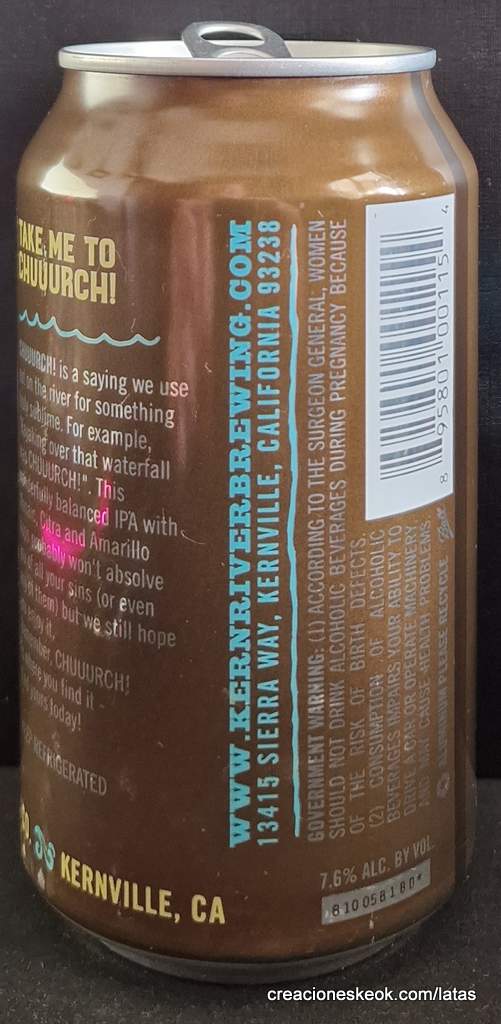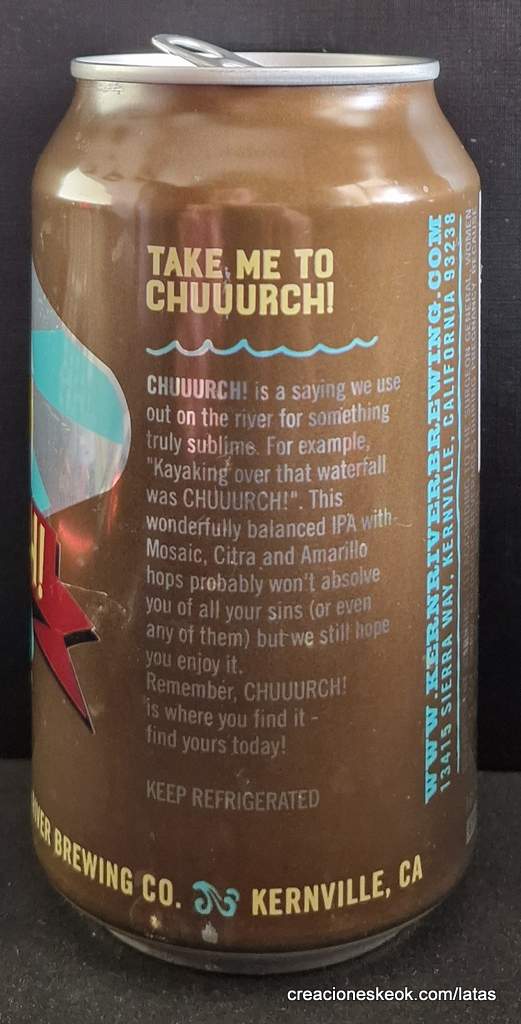 '¡Iglesiaaaa!' es un dicho que usamos en el río para algo verdaderamente sublime. Por ejemplo, "¡navegando en kayak sobre esa cascada estaba Chuuurch!". Esta IPA maravillosamente equilibrada con lúpulos Mosaic, Citra y Amarillo probablemente no te absuelva de todos tus pecados (ni siquiera de ninguno de ellos), pero aun así esperamos que la disfrutes. ¡Recuerda, Chuuurch! es donde lo encuentras; encuentra el tuyo hoy!