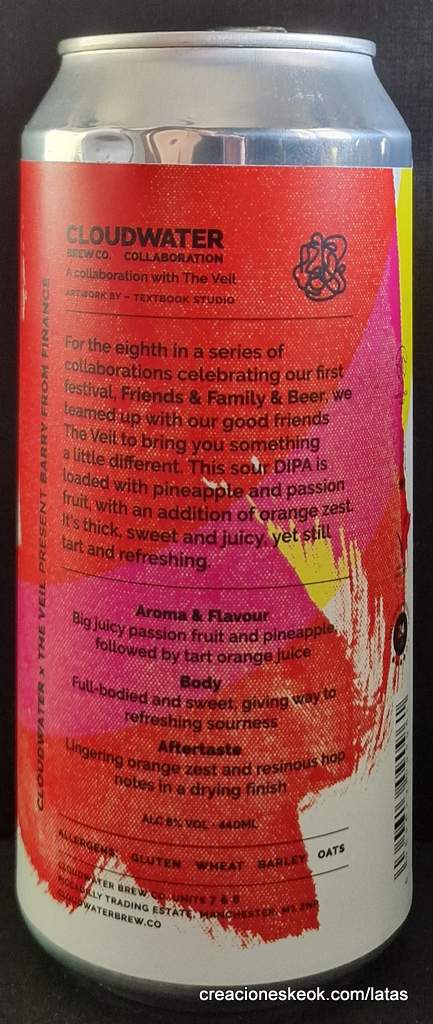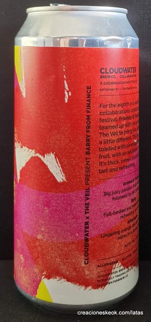 Barry From Finance es una imponente cerveza donde juntan sus talentos las prestigiosa Cloudwater y The Veil. Ingleses y americanos han ideado una receta de una Double IPA turbia, ácida y jugosa para conmemorar su primer festival de los de Manchester. Es parte de una serie de 8 colaboraciones que los de han elaborado junto a cerveceras colegas por esta efeméride. Estamos ante una cerveza con frutas. Concretamente con fruta de la pasión y piña en cantidades generosas y con un poco de piel de naranja. Con ello se consigue un trago jugoso y denso con un toque algo dulce y ácido.