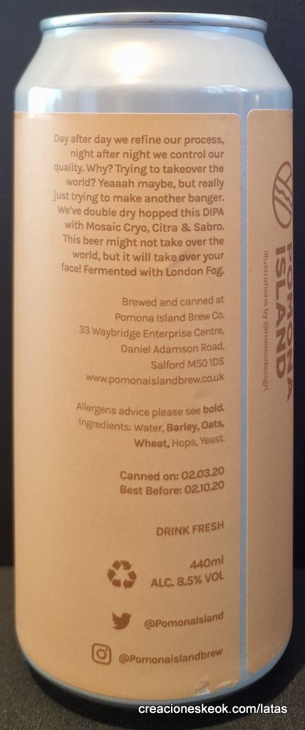 Día tras día perfeccionamos nuestro proceso, noche tras noche controlamos nuestra calidad. ¿Por qué? ¿Intentando conquistar el mundo? Sí, tal vez, pero en realidad solo estamos intentando hacer otra maravilla. Hemos aplicado doble dry hop a esta DIPA con Mosaic Cryo, Citra y Sabro. Puede que esta cerveza no se apodere del mundo, ¡pero sí de tu rostro!