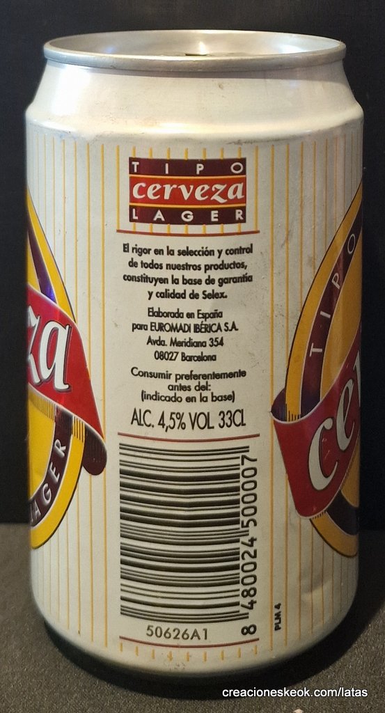 Origen de la marca Selex es la marca propia del Gruppo Selex, uno de los mayores consorcios de supermercados en Italia. Fundado en 1964, hoy agrupa a más de 3.200 puntos de venta en Italia. Bajo este sello, se venden productos de alimentación, bebidas, droguería, etc., con una imagen de calidad a precio competitivo. Versión España Diseño: Lata blanca con amarillo y burdeos, la palabra “cerveza” como elemento central. Texto destacado: “Selección y calidad – Selex”. Tipo: Lager. Formato: 33 cl. Distribución: Comercializada en cadenas de supermercados españolas asociadas. Versión Italia Diseño: Lata blanca con verde, rojo y dorado, con la denominación “Selex Bräu – Lager Bier”. Texto destacado: “Seleziona per voi – Selex”. Tipo: Lager. Formato: 33 cl.
