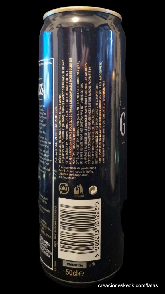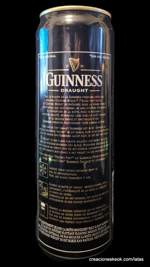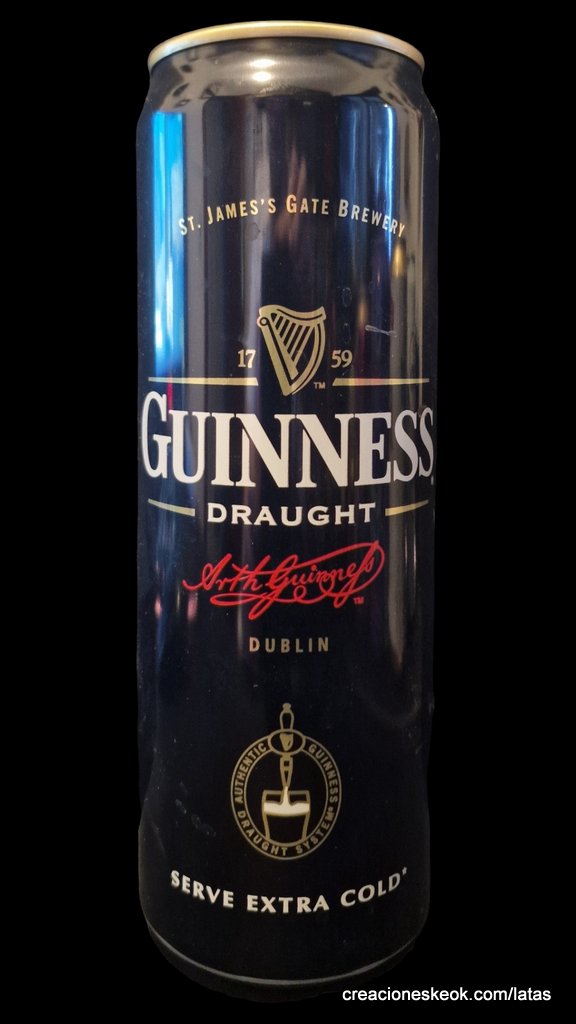 Guinness fue una de las primeras cervecerías en imprimir y etiquetar sus botellas para asegurarse de que los taberneros no mezclaran varias cervezas negras y las hicieran pasar por Guinness. Los que vendieran otras cervezas negras no podían portar el estandarte de Guinness y, en su lugar, tenían que solicitar las etiquetas propias de su cervecería, donde incluyeran su nombre y dirección. Así continuó hasta 1862, cuando se introdujo la etiqueta beige típica de Guinness. El diseño ha sufrido muchas modificaciones desde entonces, pero, a día de hoy, todas nuestras etiquetas tienen tres elementos: la firma de Arthur, nuestra legendaria y simbólica arpa y un nombre actualmente reconocido en todo el mundo... Guinness. Guinness (pronunciación en AFI : /?g?.n?s/) es una cerveza negra seca del tipo stout elaborada por primera vez por el cervecero Arthur Guinness en la empresa cervecera denominada St. James's Gate Brewery ubicada en la ciudad de Dublín, Irlanda. Guinness se elabora desde el año 1759. La cerveza se basa en el estilo porter, originado en Londres a principios de 1700. Se trata de una de las marcas de cerveza más conocidas y se exporta a la mayor parte de los países. Ha llegado a batir a muchos imitadores. La característica distintiva en el sabor es la cebada tostada que se mantiene sin fermentar. Durante muchos años una parte de la cerveza se envejecía para dar un sabor láctico, pero Guinness ha renunciado confirmar si esto sigue ocurriendo. La gruesa y cremosa espuma es resultado de una mezcla de nitrógeno añadida en el envasado. Lo que está comprobado es que no lleva café, pese a la creencia popular. La cerveza Guinness es un caso especial, donde una marca de bebida alcohólica hecha por una empresa privada ha llegado a identificar el alma de una nación. Guinness en Irlanda es toda una institución por derecho propio, llegando incluso a simbolizar al pueblo irlandés. En la actualidad y desde el año 1997 Guinness pertenece a la multinacional de bebidas espirituosas Diageo con sede en Londres, resultante de la fusión de Guinness UDV y Grand Metropolitan plc.