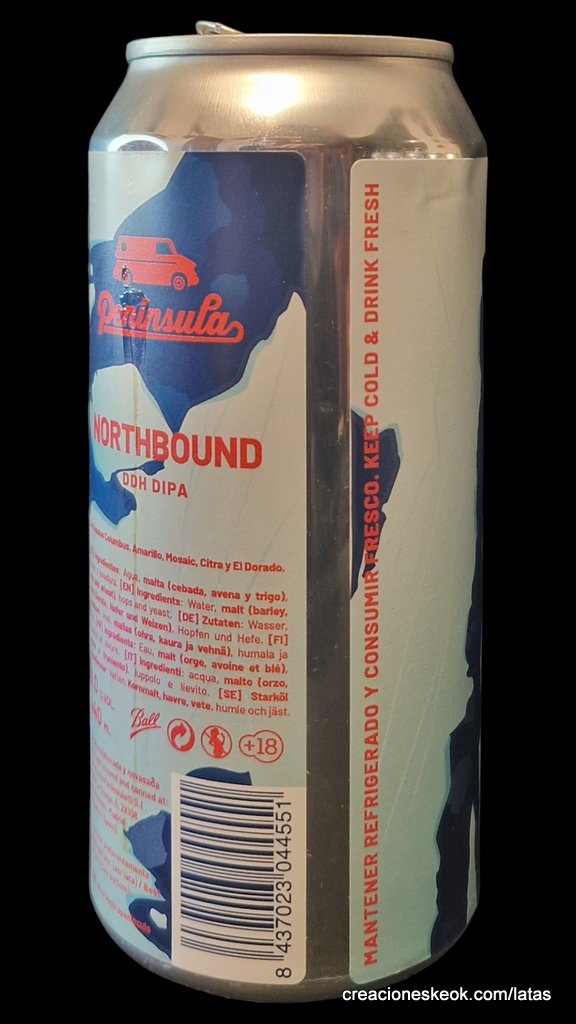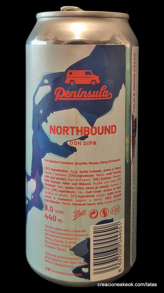 Northbound, una DDH DIPA de 8.0% con aromas a fruta de hueso, piña y resinosos. Color amarillo pajizo con con aromas a fruta de hueso, piña, tropicales y resinosos. En boca presenta un cuerpo medio-alto y amargor medio-alto.