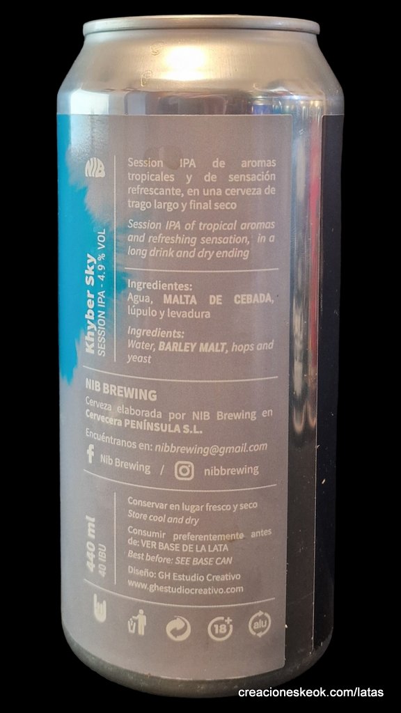 Khyber Sky de NIB Brewing es una Session IPA con tan solo 4,9%, que la hacen muy bebible y refrescante. APARIENCIA: Cerveza de color dorado ligeramente turbia y con una buena retención de una espuma esponjosa. AROMA: Su aroma es tropical, a fruta de hueso y pomelo con notas cítricas y herbales. GUSTO: En boca es una cerveza refrescante de trago largo, con un perfil resinoso y un final seco. Otra cerveza de NIB (No Industrial Beer) que no dejan de sorprendernos con la calidad de sus cervezas y con esa filosofía de hacer estilos clásicos y fuera de las modas. Pincha aquí para ver las otras cervezas disponibles aún en la BeerstoShop de esta cervecera.