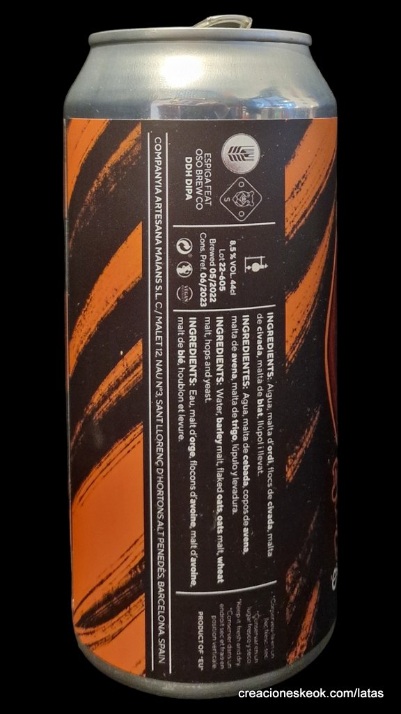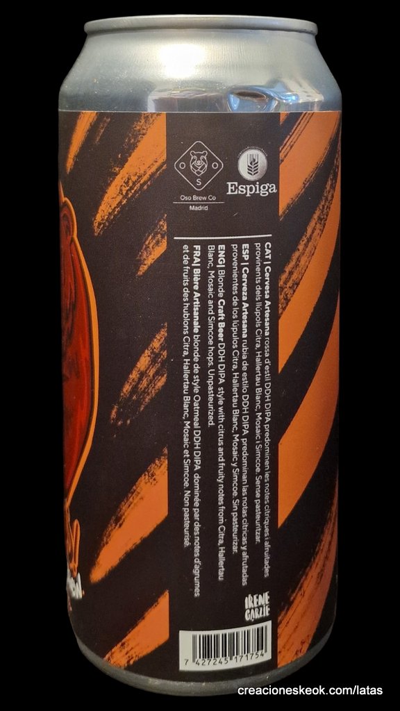 Muy contentos de volver a colaborar con la cervecería madrileña OSO BREWING y ver el resultado de esta increíble DDH DIPA. Tiene un aspecto hazy con un color dorado oscuro casi ambar. En aroma encontramos intensas notas herbales y afrutadas. Durante el trago disfrutamos de una sensación sedosa y aterciopelada gracias a la alta carga de avena utilizada, mientras saboreamos también la explosión de frutas tipo melocotón, mango y cítricos. No sentirás los 8,5 grados que tiene pero sí los kilos y kilos de lúpulos empleados. Maltas: Pale Ale, copos de avena y trigo. Lúpulos: Cascade, Citra, Hallertau blanc y Simcoe.