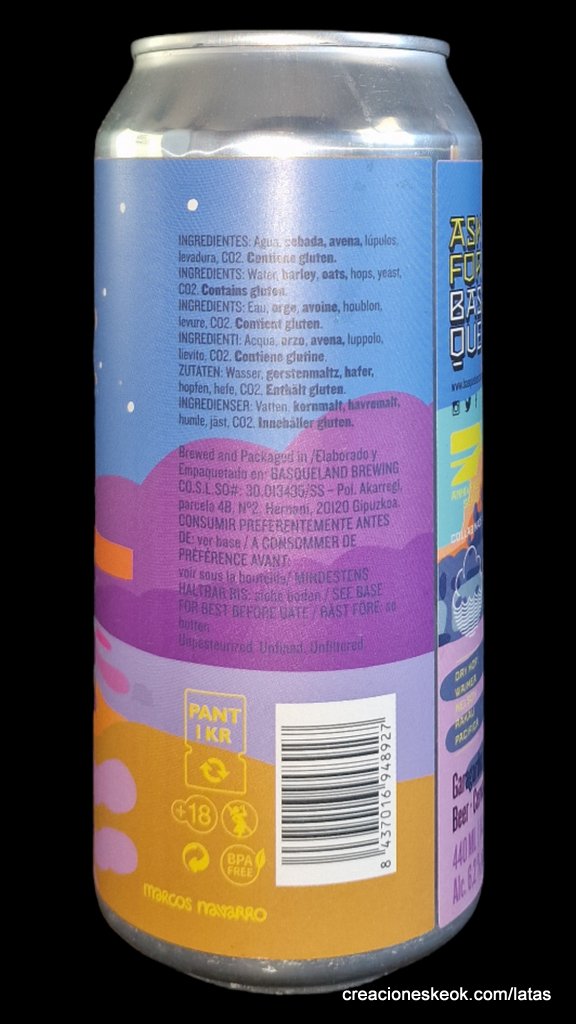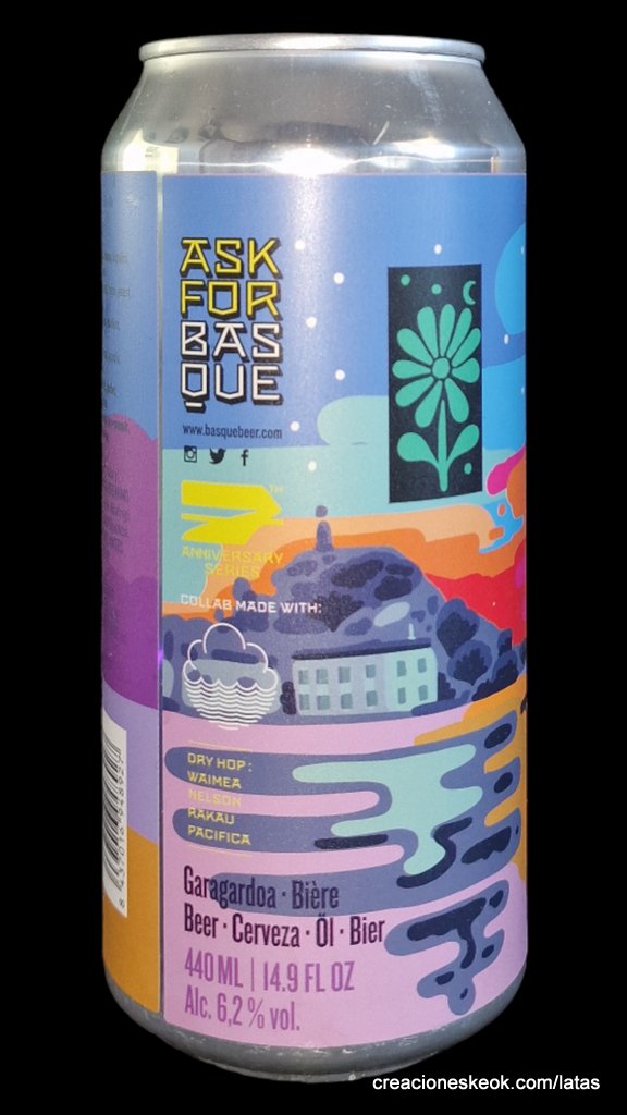 Elaborada en colaboración con la cervecera Cloudwater Brew Co. para celebrar el 7º aniversario de Basqueland. Estamos muy felices de trabajar con nuestros amigos de Manchester Cloudwater. Ha pasado demasiado tiempo desde la última. Así que creamos esta cerveza juntos: un dry-hop double con los mejores lúpulos de Nueva Zelanda. Aromas agudos e intensos de naranja, grosella, uva y melocotón surgen de una base de malta extra pale y avena tanto malteada y como en copos. ¿El resultado? Una india pale ale cremosa y turbia con un final amargo equilibrado. ¡Quizás esta sea nuestro trabajo más fino?? * Esta cerveza es una de las siete creaciones limitadas de la 7th Anniversary Series. Una serie de colaboraciones únicas e irrepetibles elaboradas con las cerveceras participantes en la fiesta del séptimo aniversario de Basqueland.