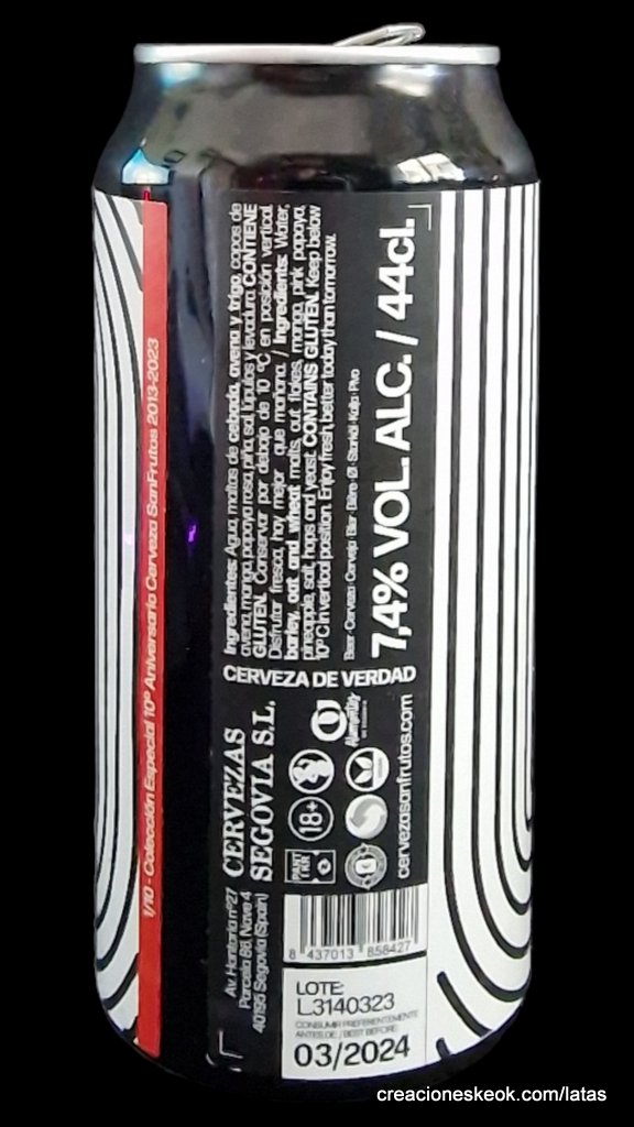 Especial X Aniversario Una explosión de sabores. Ácida, salina, muy sedosa y con una cantidad obscena de Mango, Piña y Guayaba Rosa para hacer gozar tus papilas gustativas y que valen por tus tres raciones diarias de fruta. Con 7,4% Vol. Alc. que no se nota nada.