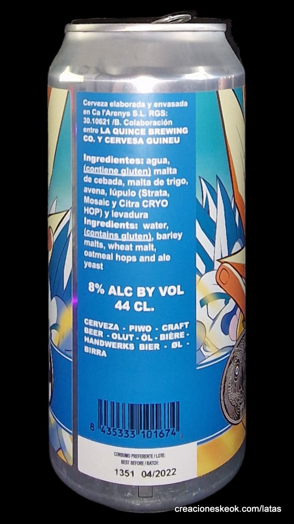 Colaboración con nuestros amigos de Cervesa Guineu para rendir homenaje a la mítica Danza de la Fusión entre Son Goten y Trunks, que da lugar al guerrero Gotenks. Elaboramos una Doble New England IPA con Doble Dry Hoppin’ de lúpulo Strata de Yakima Valley, combinado con Mosaic, Palisade y Citra Cryo. 6 maltas incluidas grandes adiciones de avena y trigo. Zumazo de 8 grados. 44cl. 8% abv.