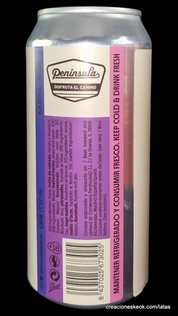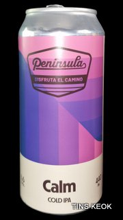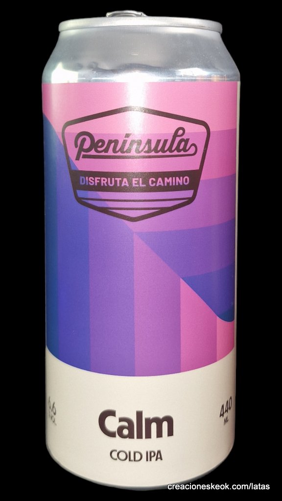 Cervecera Península Calm es una Cold IPA de Cervecera Península con lúpulos Summit, Mosaic, Lupomax Mosaic y Simcoe. Fermentada lentamente con levadura Lager a baja temperatura. Trago refrescante y ligero, con aromas y sabores afrutados, a fruta de hueso y cítricos, nota ligeramente herbal. Final seco y moderado amargor.