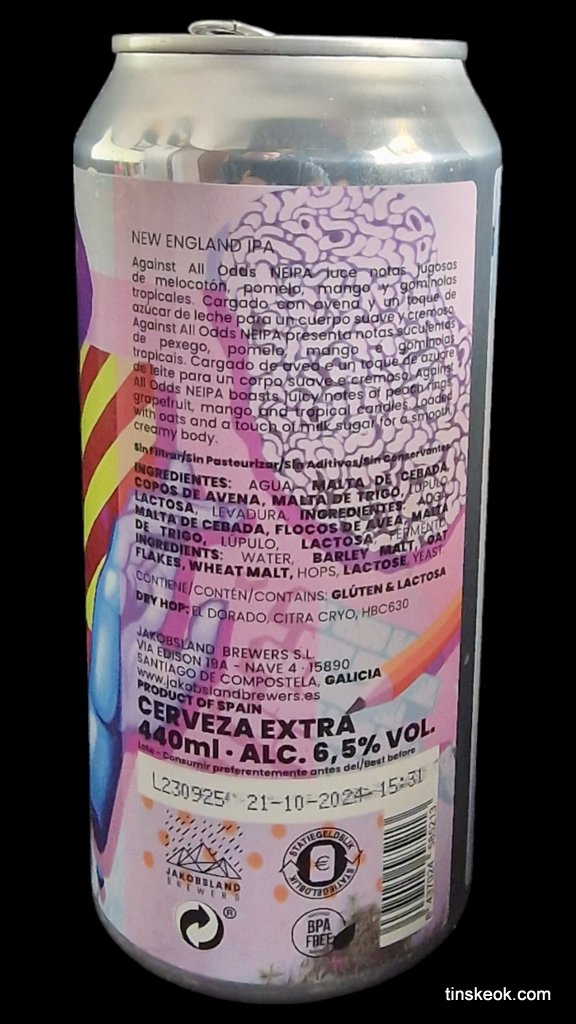 Against All Odds es una joya entre las cervezas artesanales, una NEIPA que desafía las expectativas y cautiva los sentidos. Esta NEIPA seduce desde el primer sorbo con sus notas jugosas de melocotón, pomelo, mango y gominolas tropicales, gracias a una cuidadosa combinación de lúpulos y técnicas de elaboración. Su cuerpo suave y cremoso, logrado con avena y un toque de azúcar de leche, completa una experiencia sensorial inolvidable. Lo que distingue a Against All Odds es su fermentación secuencial, comenzando como una ale y luego convirtiéndose en una lager, un proceso que realza sus características únicas y su perfil de sabor complejo. La New England IPA es conocida por su turbidez, su carácter afrutado y su textura sedosa, características que Against All Odds encarna a la perfección. Su excepcional acogida entre los amantes de la cerveza artesanal es un testimonio de su calidad y de la pasión de Jakobsland Brewers por ofrecer cervezas que desafían todas las adversidades.