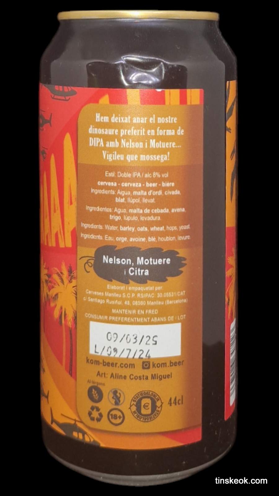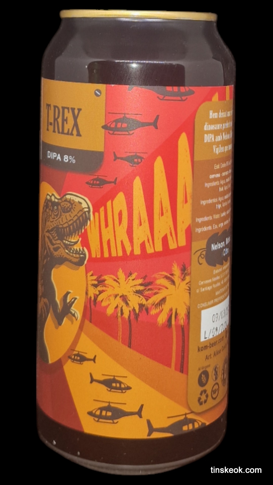 Kom Beer T-Rex es una Doble NEIPA con Moutere, Nelson Sauvin y Citra.