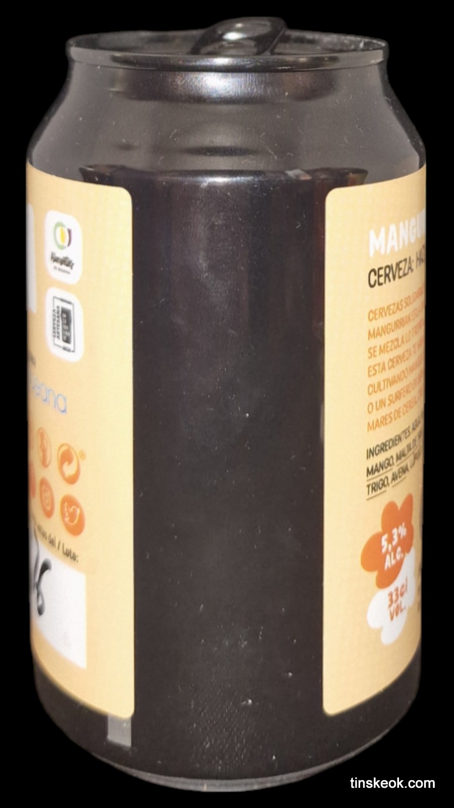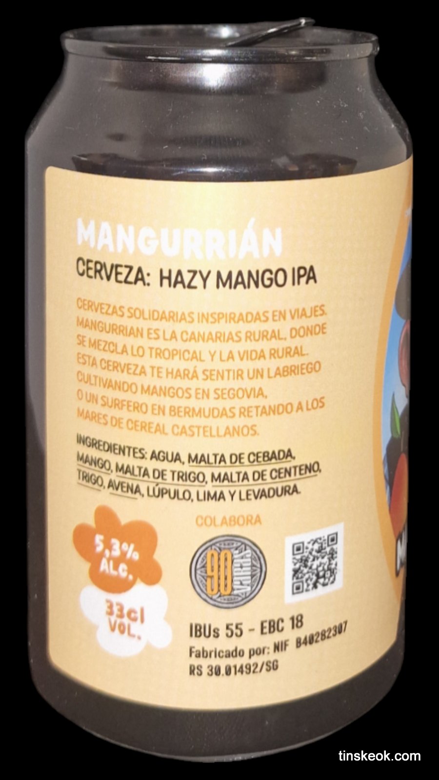 Mangurrián definición: Dícese de la persona poco civilizada, de formas toscas y asilvestradas, generalmente proviniente del medio rural, aunque no necesariamente, al poder utilizarse este término de forma metafórica, refiriendose a un urbanita de corte embrutecido y no muy refinado. Mangurrián es turbia, ligeramente amarga y con mucho aroma y tiene como adjunto Mango. Vamos a Beer, un proyecto amigo que combina viajes, solidaridad y, por supuesto, cerveza artesana en ediciones limitadas. El 50% de los beneficios obtenidos con esta cerveza van destinados a la ONG Innoceana. Asociación que se dedica a la limpieza y estudio de los fondos marinos canarios y la preservación de su biodiversidad, actuando tanto de forma física y activa con inmersiones como mediante el estudio, la investigación y la innovación.