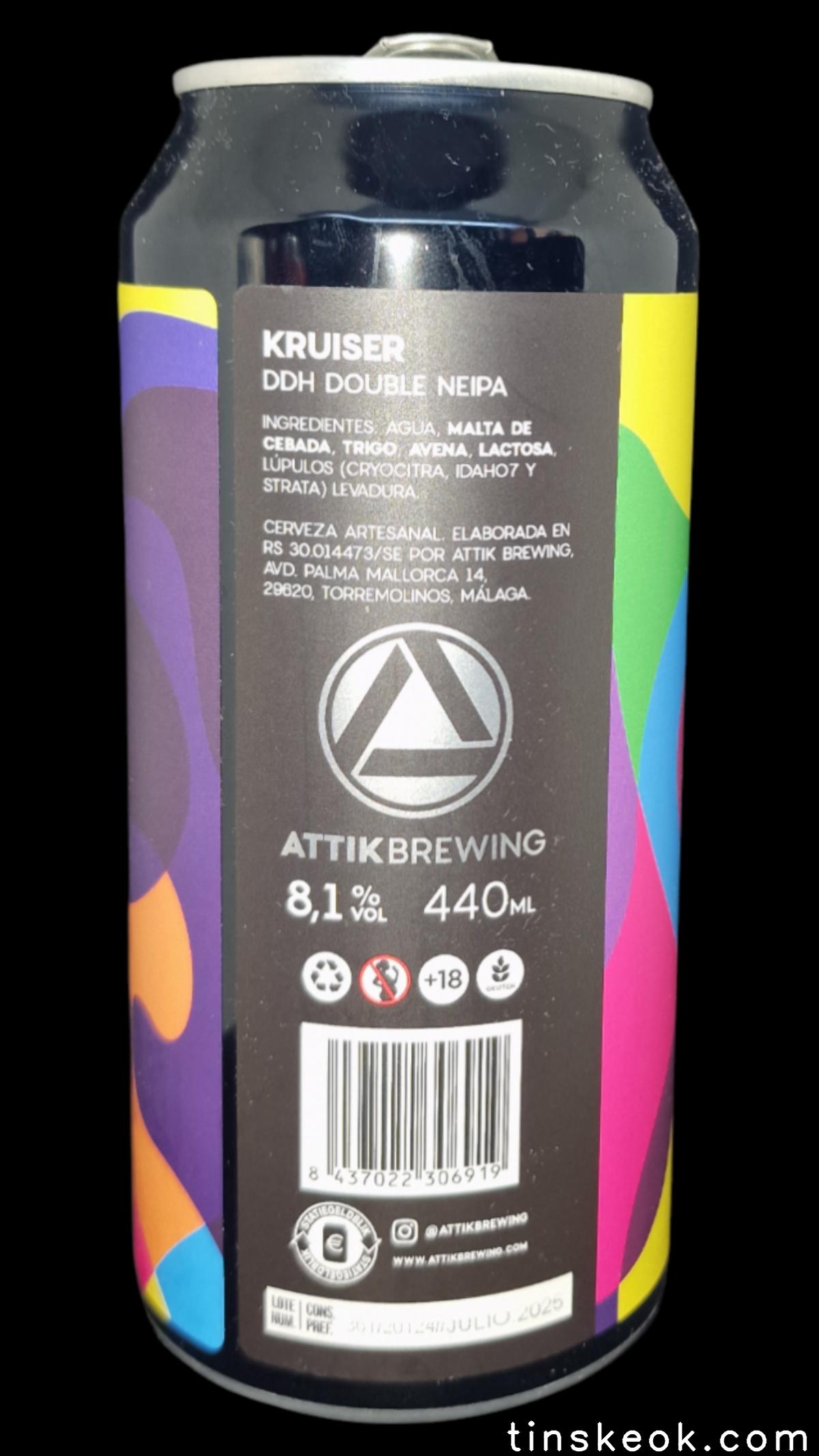 La última DDH Doble NEIPA de Attik Brewing Kruiser, que te lleva de paseo por sabores brutales. Esta birra es un derroche de lúpulos tropicales que explotan en tu boca con cada trago. La pizca de lactosa no solo le da un cuerpo elegante, sino también una textura suavecita que lo lleva a otro nivel. Cuando te acerques al vaso, «Kruiser» te lanza a un paraíso tropical con olores fuertes de papaya, kiwi y mango. El primer sorbo es una mezcla perfecta entre la intensidad de los lúpulos y la suavidad de la lactosa, como una fiesta tropical en tu lengua.