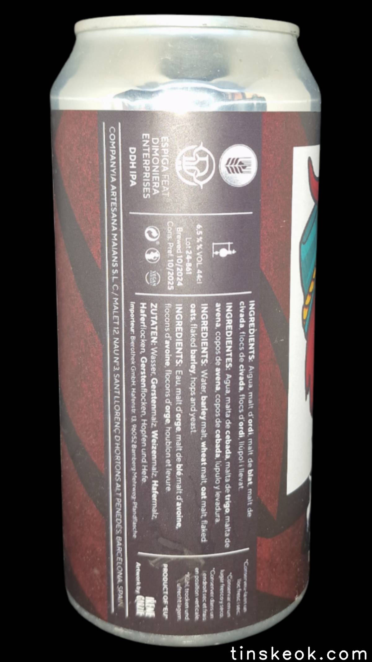Dimoniz, es una IPA DDH que surge de una colaboración muy especial con nuestro partner de Mallorca Dimoniera Enterprises. Queríamos conseguir una IPA de perfil muy afrutado y lo hemos conseguido gracias a la selección de los lúpulos Ekuanot, Idaho 7 y los neozelandeses Nelson sauvin y Riwaka. Tiene un aspecto turbio y de color amarillo dorado, coronada con una espuma blanca y persistente. El «Dimoniz» ofrece notas intentas de piña, papaya, fruta de la pasión, uva blanca que combinadas con un fondo de notas cítricas que hace irresistible probar está bomba endemoniadamente lupulada! Disfruta de un trago sedoso y lleno de frutas tropicales.