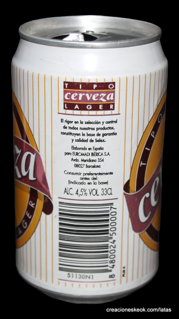Origen de la marca Selex es la marca propia del Gruppo Selex, uno de los mayores consorcios de supermercados en Italia. Fundado en 1964, hoy agrupa a más de 3.200 puntos de venta en Italia. Bajo este sello, se venden productos de alimentación, bebidas, droguería, etc., con una imagen de calidad a precio competitivo. Versión España Diseño: Lata blanca con amarillo y burdeos, la palabra “cerveza” como elemento central. Texto destacado: “Selección y calidad – Selex”. Tipo: Lager. Formato: 33 cl. Distribución: Comercializada en cadenas de supermercados españolas asociadas. Versión Italia Diseño: Lata blanca con verde, rojo y dorado, con la denominación “Selex Bräu – Lager Bier”. Texto destacado: “Seleziona per voi – Selex”. Tipo: Lager. Formato: 33 cl.