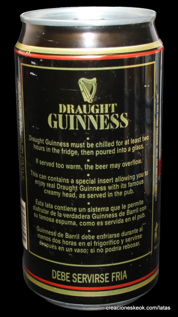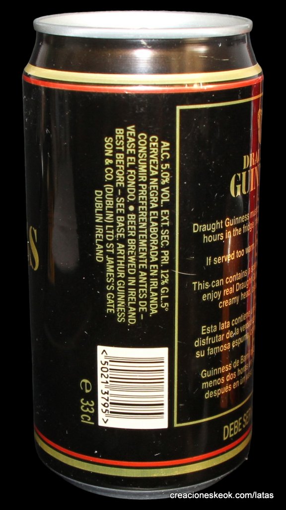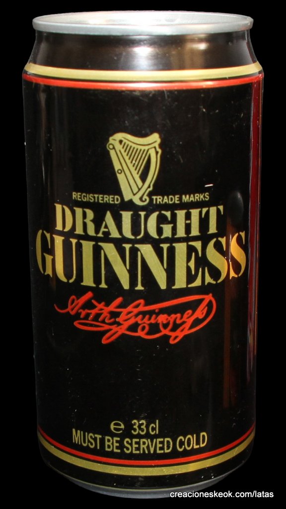 Guinness fue una de las primeras cervecerías en imprimir y etiquetar sus botellas para asegurarse de que los taberneros no mezclaran varias cervezas negras y las hicieran pasar por Guinness. Los que vendieran otras cervezas negras no podían portar el estandarte de Guinness y, en su lugar, tenían que solicitar las etiquetas propias de su cervecería, donde incluyeran su nombre y dirección. Así continuó hasta 1862, cuando se introdujo la etiqueta beige típica de Guinness. El diseño ha sufrido muchas modificaciones desde entonces, pero, a día de hoy, todas nuestras etiquetas tienen tres elementos: la firma de Arthur, nuestra legendaria y simbólica arpa y un nombre actualmente reconocido en todo el mundo... Guinness. Guinness (pronunciación en AFI : /?g?.n?s/) es una cerveza negra seca del tipo stout elaborada por primera vez por el cervecero Arthur Guinness en la empresa cervecera denominada St. James's Gate Brewery ubicada en la ciudad de Dublín, Irlanda. Guinness se elabora desde el año 1759. La cerveza se basa en el estilo porter, originado en Londres a principios de 1700. Se trata de una de las marcas de cerveza más conocidas y se exporta a la mayor parte de los países. Ha llegado a batir a muchos imitadores. La característica distintiva en el sabor es la cebada tostada que se mantiene sin fermentar. Durante muchos años una parte de la cerveza se envejecía para dar un sabor láctico, pero Guinness ha renunciado confirmar si esto sigue ocurriendo. La gruesa y cremosa espuma es resultado de una mezcla de nitrógeno añadida en el envasado. Lo que está comprobado es que no lleva café, pese a la creencia popular. La cerveza Guinness es un caso especial, donde una marca de bebida alcohólica hecha por una empresa privada ha llegado a identificar el alma de una nación. Guinness en Irlanda es toda una institución por derecho propio, llegando incluso a simbolizar al pueblo irlandés. En la actualidad y desde el año 1997 Guinness pertenece a la multinacional de bebidas espirituosas Diageo con sede en Londres, resultante de la fusión de Guinness UDV y Grand Metropolitan plc.