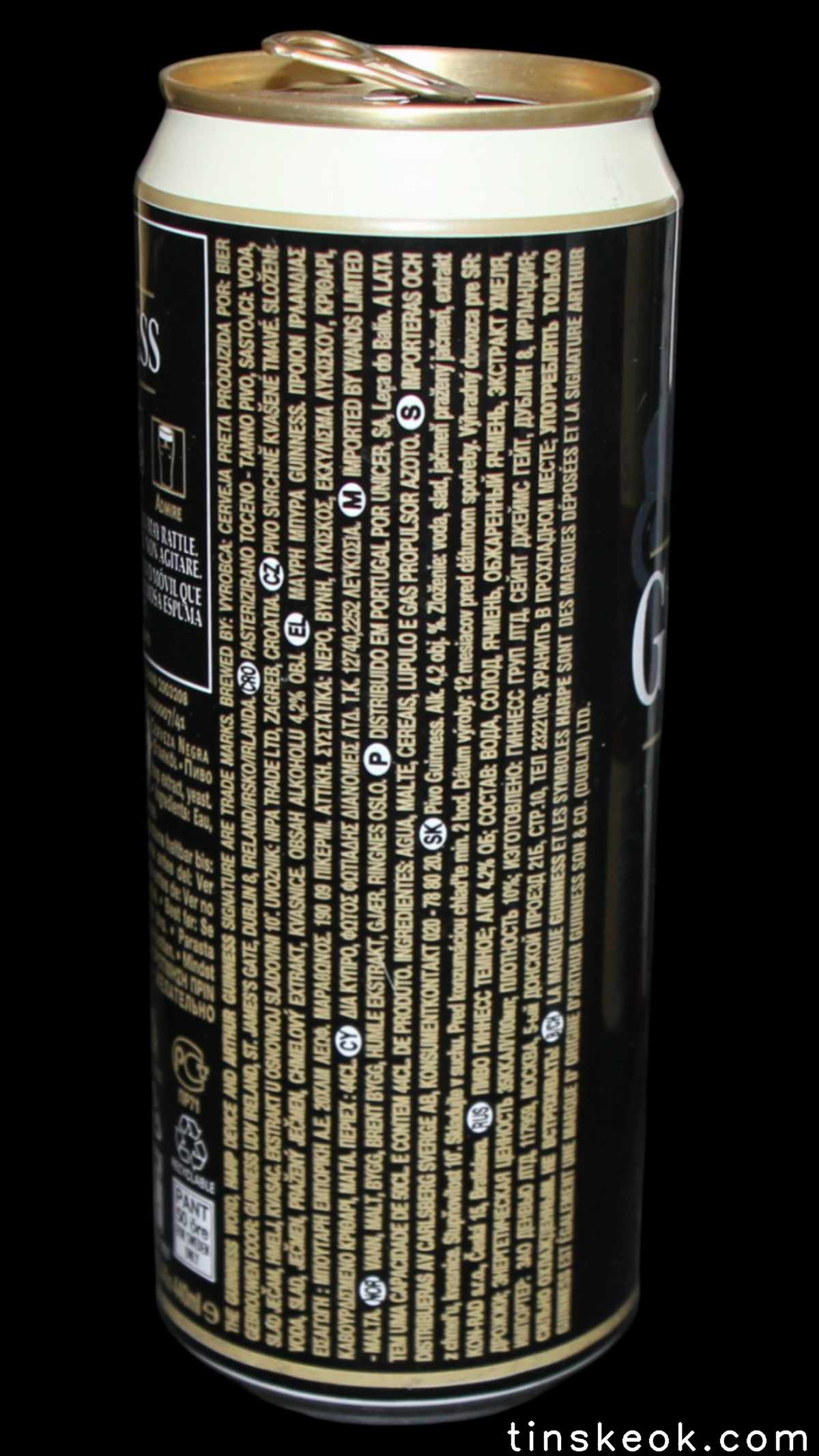Guinness fue una de las primeras cervecerías en imprimir y etiquetar sus botellas para asegurarse de que los taberneros no mezclaran varias cervezas negras y las hicieran pasar por Guinness. Los que vendieran otras cervezas negras no podían portar el estandarte de Guinness y, en su lugar, tenían que solicitar las etiquetas propias de su cervecería, donde incluyeran su nombre y dirección. Así continuó hasta 1862, cuando se introdujo la etiqueta beige típica de Guinness. El diseño ha sufrido muchas modificaciones desde entonces, pero, a día de hoy, todas nuestras etiquetas tienen tres elementos: la firma de Arthur, nuestra legendaria y simbólica arpa y un nombre actualmente reconocido en todo el mundo... Guinness. Guinness (pronunciación en AFI : /?g?.n?s/) es una cerveza negra seca del tipo stout elaborada por primera vez por el cervecero Arthur Guinness en la empresa cervecera denominada St. James's Gate Brewery ubicada en la ciudad de Dublín, Irlanda. Guinness se elabora desde el año 1759. La cerveza se basa en el estilo porter, originado en Londres a principios de 1700. Se trata de una de las marcas de cerveza más conocidas y se exporta a la mayor parte de los países. Ha llegado a batir a muchos imitadores. La característica distintiva en el sabor es la cebada tostada que se mantiene sin fermentar. Durante muchos años una parte de la cerveza se envejecía para dar un sabor láctico, pero Guinness ha renunciado confirmar si esto sigue ocurriendo. La gruesa y cremosa espuma es resultado de una mezcla de nitrógeno añadida en el envasado. Lo que está comprobado es que no lleva café, pese a la creencia popular. La cerveza Guinness es un caso especial, donde una marca de bebida alcohólica hecha por una empresa privada ha llegado a identificar el alma de una nación. Guinness en Irlanda es toda una institución por derecho propio, llegando incluso a simbolizar al pueblo irlandés. En la actualidad y desde el año 1997 Guinness pertenece a la multinacional de bebidas espirituosas Diageo con sede en Londres, resultante de la fusión de Guinness UDV y Grand Metropolitan plc.