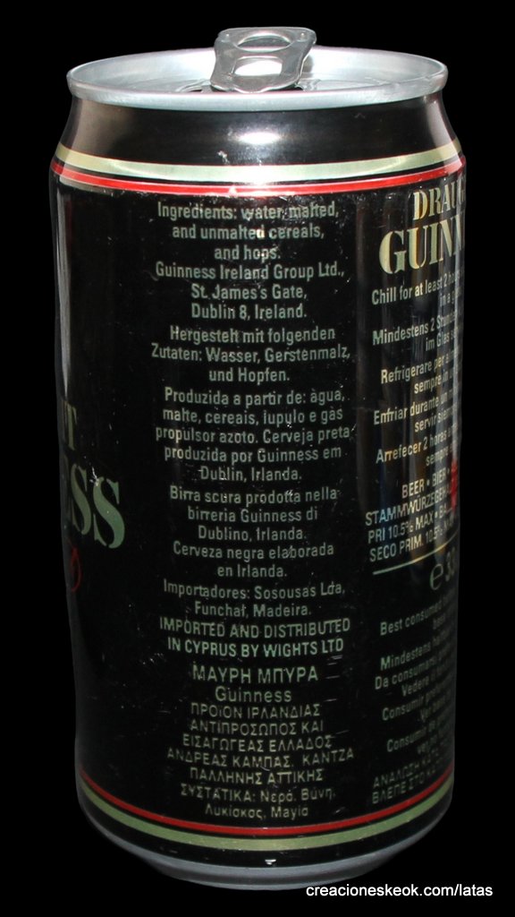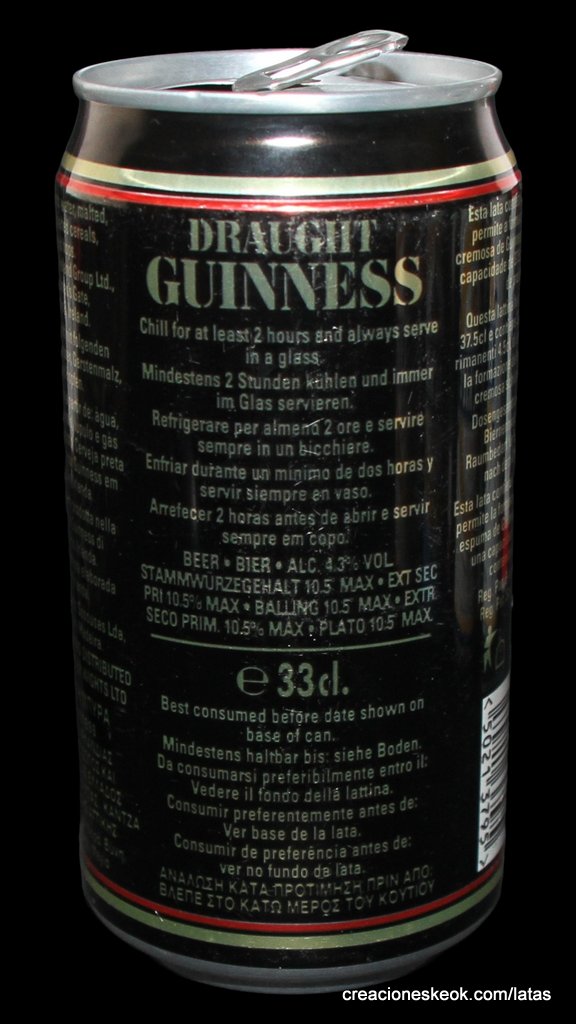 Guinness fue una de las primeras cervecerías en imprimir y etiquetar sus botellas para asegurarse de que los taberneros no mezclaran varias cervezas negras y las hicieran pasar por Guinness. Los que vendieran otras cervezas negras no podían portar el estandarte de Guinness y, en su lugar, tenían que solicitar las etiquetas propias de su cervecería, donde incluyeran su nombre y dirección. Así continuó hasta 1862, cuando se introdujo la etiqueta beige típica de Guinness. El diseño ha sufrido muchas modificaciones desde entonces, pero, a día de hoy, todas nuestras etiquetas tienen tres elementos: la firma de Arthur, nuestra legendaria y simbólica arpa y un nombre actualmente reconocido en todo el mundo... Guinness. Guinness (pronunciación en AFI : /?g?.n?s/) es una cerveza negra seca del tipo stout elaborada por primera vez por el cervecero Arthur Guinness en la empresa cervecera denominada St. James's Gate Brewery ubicada en la ciudad de Dublín, Irlanda. Guinness se elabora desde el año 1759. La cerveza se basa en el estilo porter, originado en Londres a principios de 1700. Se trata de una de las marcas de cerveza más conocidas y se exporta a la mayor parte de los países. Ha llegado a batir a muchos imitadores. La característica distintiva en el sabor es la cebada tostada que se mantiene sin fermentar. Durante muchos años una parte de la cerveza se envejecía para dar un sabor láctico, pero Guinness ha renunciado confirmar si esto sigue ocurriendo. La gruesa y cremosa espuma es resultado de una mezcla de nitrógeno añadida en el envasado. Lo que está comprobado es que no lleva café, pese a la creencia popular. La cerveza Guinness es un caso especial, donde una marca de bebida alcohólica hecha por una empresa privada ha llegado a identificar el alma de una nación. Guinness en Irlanda es toda una institución por derecho propio, llegando incluso a simbolizar al pueblo irlandés. En la actualidad y desde el año 1997 Guinness pertenece a la multinacional de bebidas espirituosas Diageo con sede en Londres, resultante de la fusión de Guinness UDV y Grand Metropolitan plc.