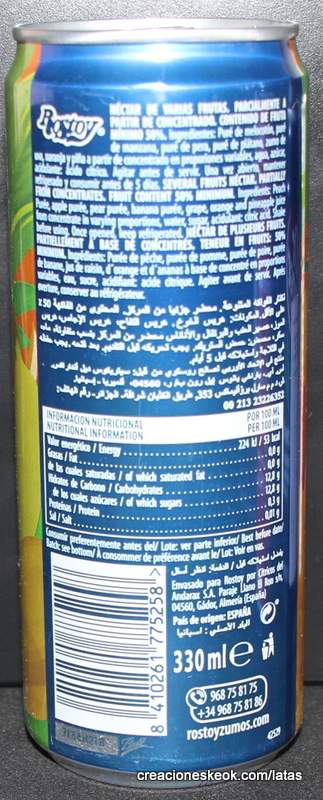 Ingredientes: Puré de Melocotón, puré de Manzana, puré de Pera, puré de Plátano, zumo de Uva, Naranja y Piña a partir de concentrado en proporciones variables, agua, azúcar, acidulante: ácido cítrico y antioxidante: ácido ascórbico.