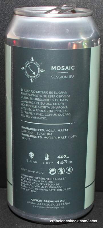 El lúpulo Mosaic es el gran protagonista de esta cerveza rubia, refrescante y de baja graduación. Su uso en dry hopping le aporta un aroma intenso a frutas tropicales, cítricos y pino, con un cuerpo ligero y amargo.