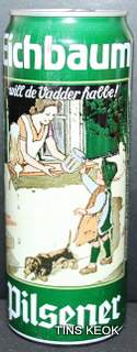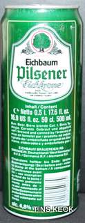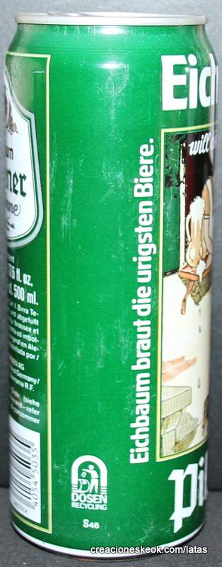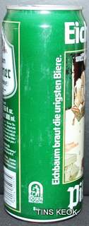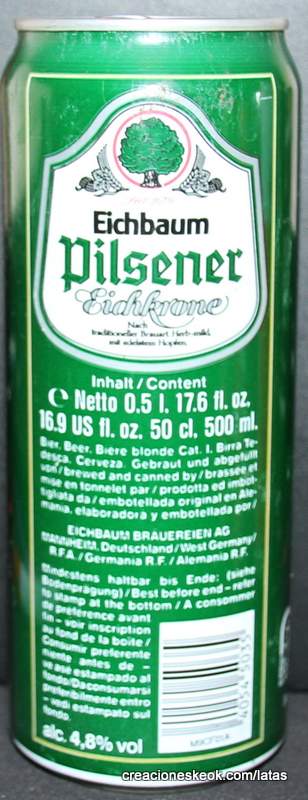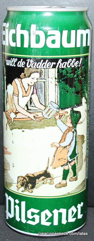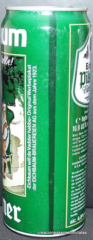 Lata de cerveza Eichbaum fabricada en Alemania en la década del 80, esta cervecería con sede en Mannheim se fundo en 1679 de la mano de Jean du Chaine, en ese momento en la región de Mannheim ya había cerca de 25 tabernas que se dedicaban a producir cerveza. En 1689 fue destruida la cervecería, al ser victima de la Guerra de Sucesión del Palatinado, en 1717 se reconstruyo, en 1827 empezó un plan de expansión de la empresa, en 1870 trasladaron la producción a un sitio mas grande (donde todavía se encuentran las instalaciones), en 1881 se convirtió en sociedad anónima, hasta convertirse antes de la 1ra Guerra Mundial en una de las cervecerías mas grandes del país. Luego de finalizada la guerra la ocupación aliada de las zonas cercanas, corto una gran cuota de mercado, por ello en 1929 se asociaron a otras cervecerías para formar Eichbaum Werger Brauereien AG. La empresa paso por tiempos de crisis hasta 1936, aunque al comienzo de la 2da Guerra Mundial, volvió a caer a niveles muy bajos, luego de la guerra, al conseguir un contrato de proveedor del ejercito estadounidense, la empresa fue reconstruida rápidamente, en 1970 fue comprada por Henninger, en 1998 fue adquirida por la empresa de bebidas Actris. Como nota de color, se puede decir que los pozos de agua que la empresa utiliza, esta justo al lado del cementerio principal de Mannheim, eso provoca leyendas y bromas referidas a las propiedades y gusto de la cerveza.