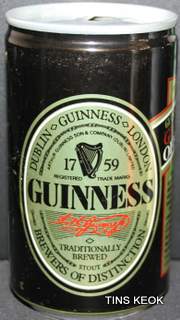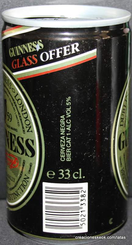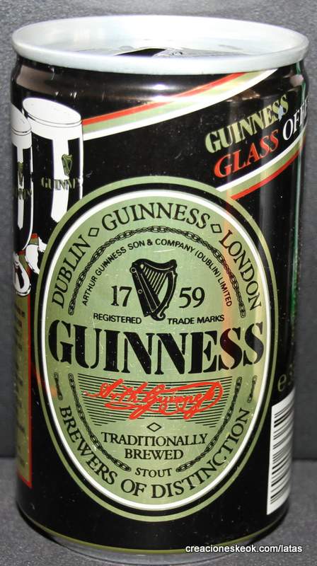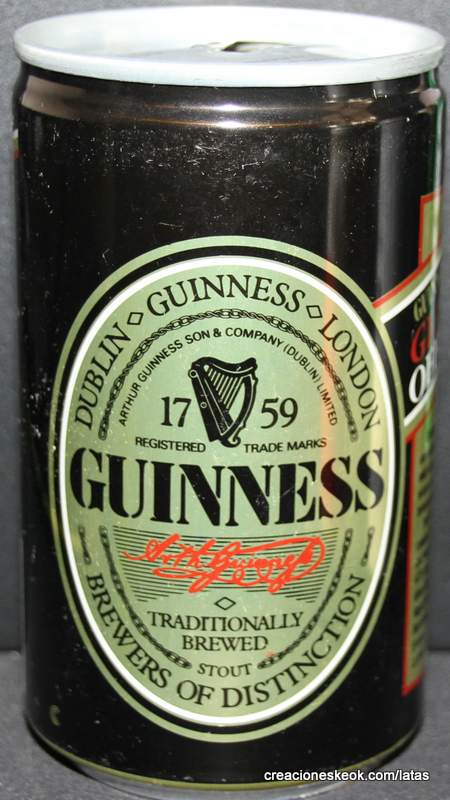 Guinness fue una de las primeras cervecerías en imprimir y etiquetar sus botellas para asegurarse de que los taberneros no mezclaran varias cervezas negras y las hicieran pasar por Guinness. Los que vendieran otras cervezas negras no podían portar el estandarte de Guinness y, en su lugar, tenían que solicitar las etiquetas propias de su cervecería, donde incluyeran su nombre y dirección. Así continuó hasta 1862, cuando se introdujo la etiqueta beige típica de Guinness. El diseño ha sufrido muchas modificaciones desde entonces, pero, a día de hoy, todas nuestras etiquetas tienen tres elementos: la firma de Arthur, nuestra legendaria y simbólica arpa y un nombre actualmente reconocido en todo el mundo... Guinness. Guinness (pronunciación en AFI : /?g?.n?s/) es una cerveza negra seca del tipo stout elaborada por primera vez por el cervecero Arthur Guinness en la empresa cervecera denominada St. James's Gate Brewery ubicada en la ciudad de Dublín, Irlanda. Guinness se elabora desde el año 1759. La cerveza se basa en el estilo porter, originado en Londres a principios de 1700. Se trata de una de las marcas de cerveza más conocidas y se exporta a la mayor parte de los países. Ha llegado a batir a muchos imitadores. La característica distintiva en el sabor es la cebada tostada que se mantiene sin fermentar. Durante muchos años una parte de la cerveza se envejecía para dar un sabor láctico, pero Guinness ha renunciado confirmar si esto sigue ocurriendo. La gruesa y cremosa espuma es resultado de una mezcla de nitrógeno añadida en el envasado. Lo que está comprobado es que no lleva café, pese a la creencia popular. La cerveza Guinness es un caso especial, donde una marca de bebida alcohólica hecha por una empresa privada ha llegado a identificar el alma de una nación. Guinness en Irlanda es toda una institución por derecho propio, llegando incluso a simbolizar al pueblo irlandés. En la actualidad y desde el año 1997 Guinness pertenece a la multinacional de bebidas espirituosas Diageo con sede en Londres, resultante de la fusión de Guinness UDV y Grand Metropolitan plc.