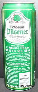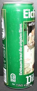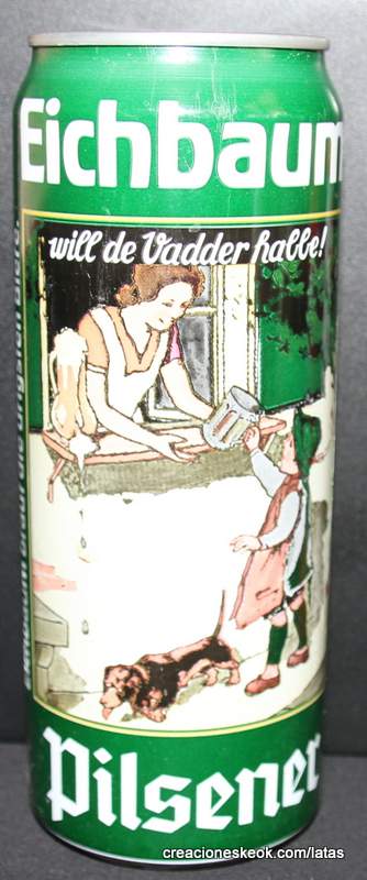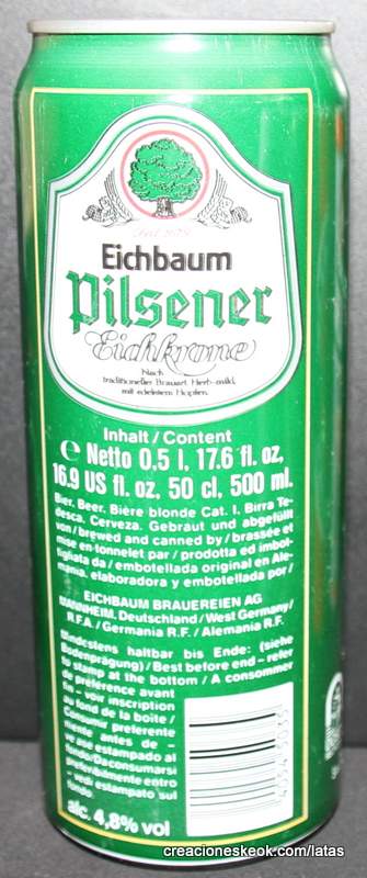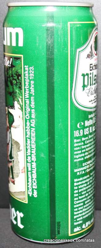 Lata de cerveza Eichbaum fabricada en Alemania en la década del 80, esta cervecería con sede en Mannheim se fundo en 1679 de la mano de Jean du Chaine, en ese momento en la región de Mannheim ya había cerca de 25 tabernas que se dedicaban a producir cerveza. En 1689 fue destruida la cervecería, al ser victima de la Guerra de Sucesión del Palatinado, en 1717 se reconstruyo, en 1827 empezó un plan de expansión de la empresa, en 1870 trasladaron la producción a un sitio mas grande (donde todavía se encuentran las instalaciones), en 1881 se convirtió en sociedad anónima, hasta convertirse antes de la 1ra Guerra Mundial en una de las cervecerías mas grandes del país. Luego de finalizada la guerra la ocupación aliada de las zonas cercanas, corto una gran cuota de mercado, por ello en 1929 se asociaron a otras cervecerías para formar Eichbaum Werger Brauereien AG. La empresa paso por tiempos de crisis hasta 1936, aunque al comienzo de la 2da Guerra Mundial, volvió a caer a niveles muy bajos, luego de la guerra, al conseguir un contrato de proveedor del ejercito estadounidense, la empresa fue reconstruida rápidamente, en 1970 fue comprada por Henninger, en 1998 fue adquirida por la empresa de bebidas Actris. Como nota de color, se puede decir que los pozos de agua que la empresa utiliza, esta justo al lado del cementerio principal de Mannheim, eso provoca leyendas y bromas referidas a las propiedades y gusto de la cerveza.