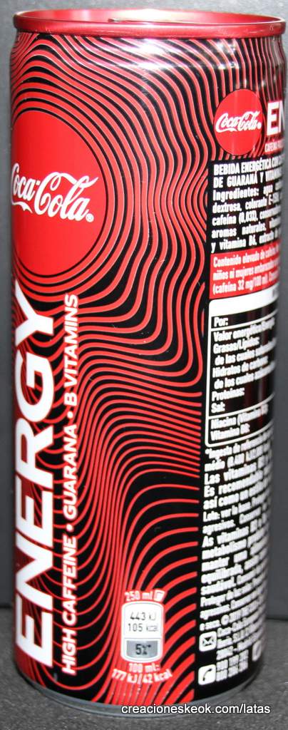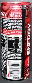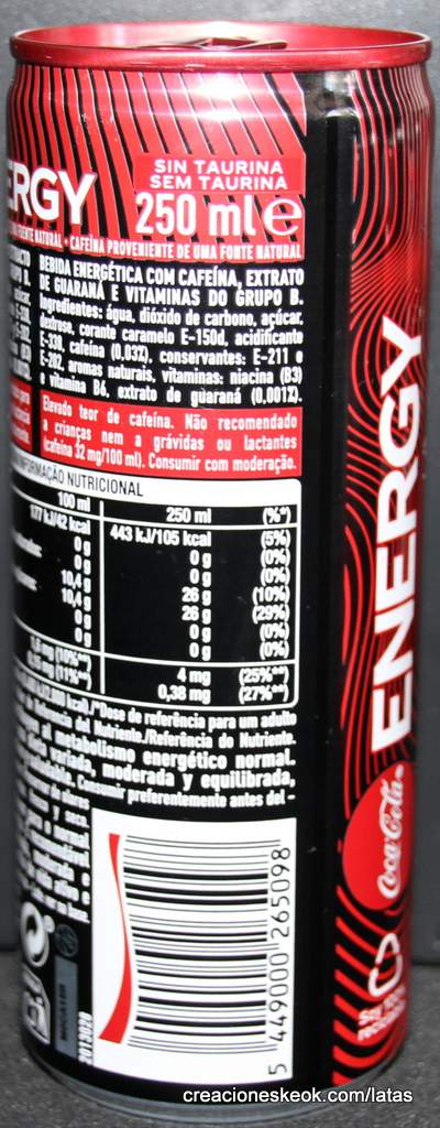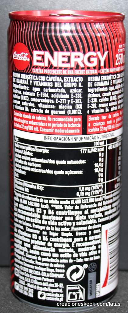Bebida energética con cafeína, extracto de guaraná y vitaminas del grupo b contenido elevado de cafeína. no recomendado para niños ni mujeres embarazadas o en período de lactancia ( cafeína 32 mg/ 100 ml). Agua carbonatada, azúcar, dextrosa, acidulantes: ácido cítrico y ácido fosfórico, aromas naturales, colorante E150d, corrector de acidez: bicarbonato sódico, cafeína (0,03 %), conservadores: benzoato sódico y sorbato potásico, vitaminas: niacina (B3) y vitamina B6, extracto de guaraná (0.001%).
