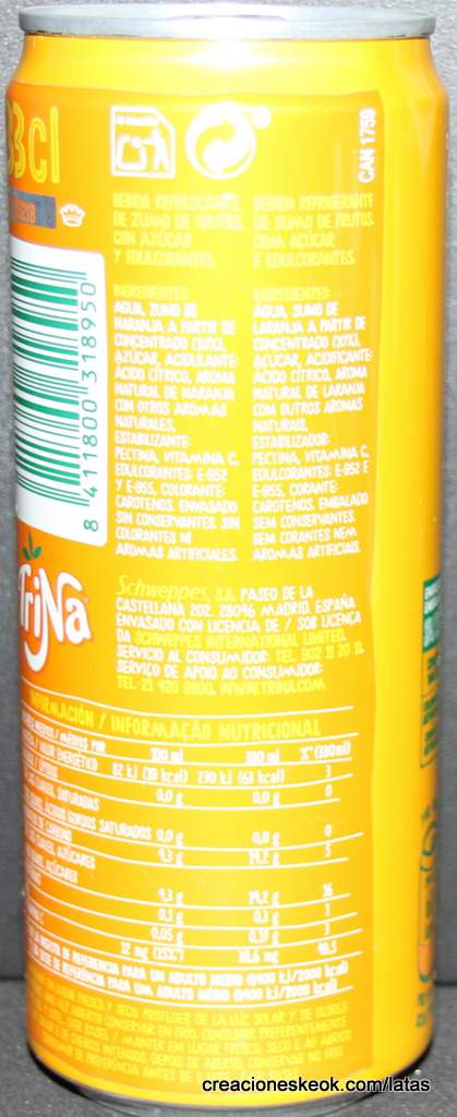 TriNa es una marca española de bebidas refrescantes sin gas. Fue el primer refresco de frutas sin burbujas en el mercado español sin gas, nacido en 1934 y con el nombre de TriNaranjus por su contenido: el zumo de tres naranjas. TriNa es una marca del grupo Schweppes Suntory España. Los orígenes de la TriNa se remontan a los años 30. Fue la creación de un pionero, el Dr. Trigo, que en 1934, desde su laboratorio de la calle Sagunto, lanzó en Valencia un refresco de naranja muy natural, sin burbujas, al que bautizó como Trinaranjus. Este nombre viene porque la base de su receta son tres variedades de naranja diferentes: Naranja Valencia, Salustiana y Cadenera. La compañía se expandió a lo largo de los años, hasta que en 1986 la marca renovó su imagen, su género (una Trina) y su nombre a TriNa. En 2009, Suntory Group adquiere la compañía Orangina Schweppes, y con ello, la marca TriNa. Este producto se comercializa en España y Portugal tanto en hostelería como en supermercados e hipermercados. Fuente : Wikipedia Leer un poco más de su historia