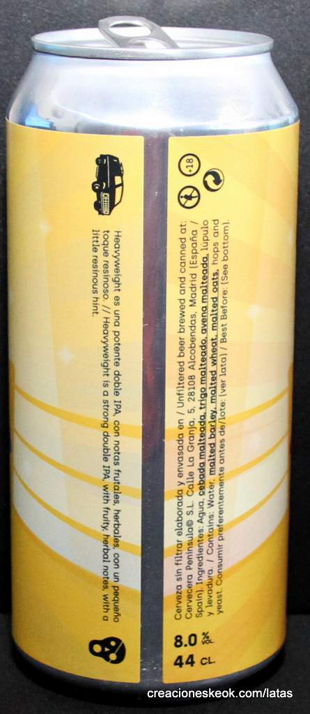 Heavyweight es una Double IPA, de 8%, con lúpulos Columbus, Mosaic y Simcoe, en colaboración con La Pirata Brewing. Afrutada, herbal y con notas resinosas.