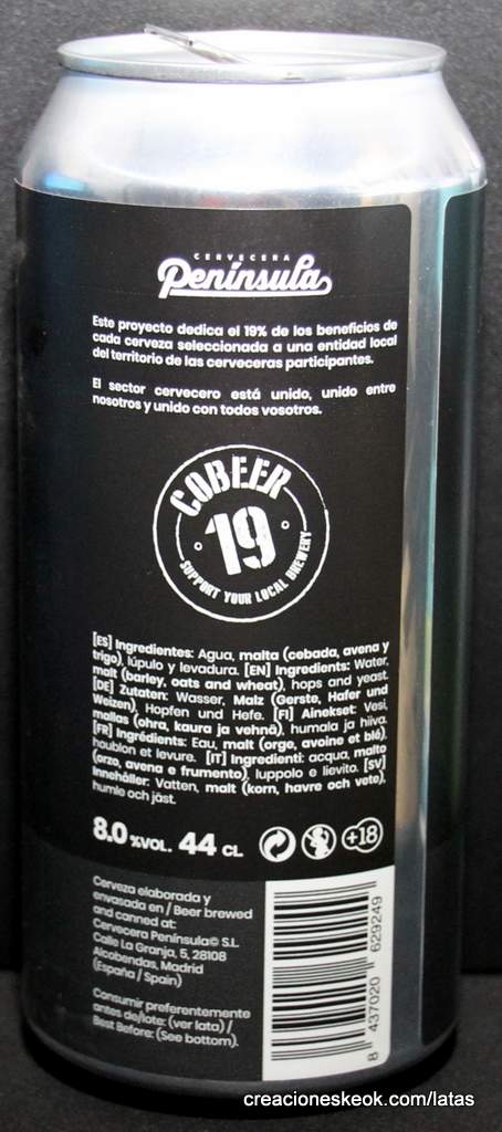 Cobeer-19 es una DDH DIPA de 8.0%, elaborada con los lúpulos Mosaic, Simcoe, Loral y Amarillo. Es nuestra aportación al proyecto colaborativo Cobeer-19, en el que el 19% de los beneficios se destina a proyectos sociales.